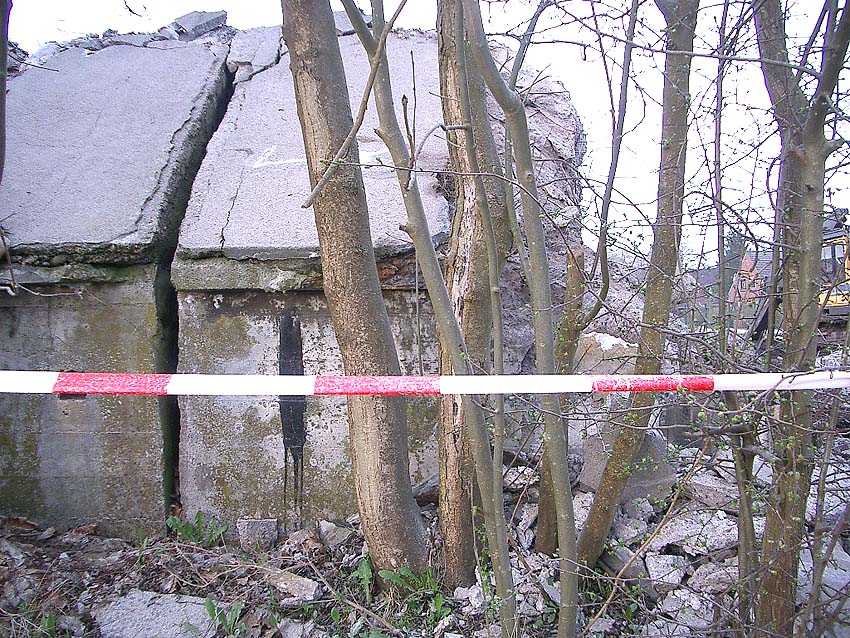 09.03.06: Seit den ersten Abrissarbeiten vor einer Woche ist nichts weiter geschehen. Ein Abrissstop ist eingetreten, da durch die Erschütterungen der ersten Maßnahme das gegenüberliegende Gaststättengebäude drohte, beeinträchtigt zu werden! Nun soll versucht werden, den Bunker mit einer speziellen Diamantsäge zu zerkleinern! Die Kosten dürften bei dieser Art des Abrisses höher sein, als zunächst eingeplant...