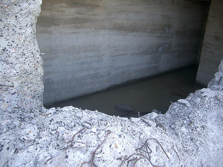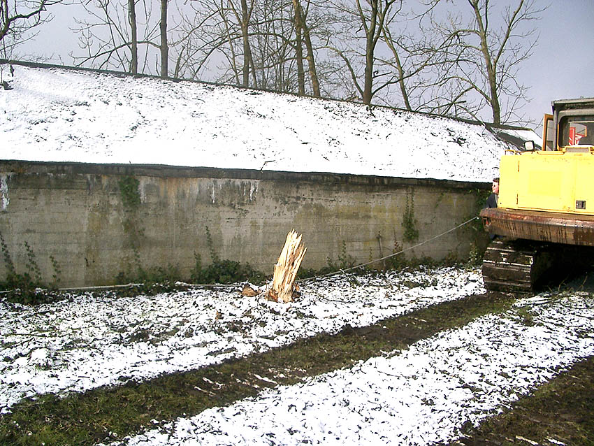 05.05.06: Der Abriss wurde letzte Woche weiter fortgeführt! Die frühere mittlere Kammer wurde nun seitlich aufgebrochen, zusammen mit dem Druckprellwandbereich und Teilen der darauf folgenden zweiten Kammer aus Nordrichtung. Wasser ist von der vorherigen Kammer aufgrund der Öffnungen und der Erschütterungen, sowie der daraus erfolgenden Bewegung des Objektes (dies stützt unsere These vom Absacken des südlichen Teiles in den letzten Jahrzehnten, anscheinend ist der Boden in diesem Bereich sehr nachgiebig...) im weichen Bodengrund in die aufgebrochene ehemalige mittlere Kammer sowie in die folgende Kammer in Richtung Norden gelaufen. Einzelne große Trümmer liegen seitlich östlich und südöstlich des Grabens. Erstaunlich, dass ein Bagger derartige Leistungen vollbringen kann:
