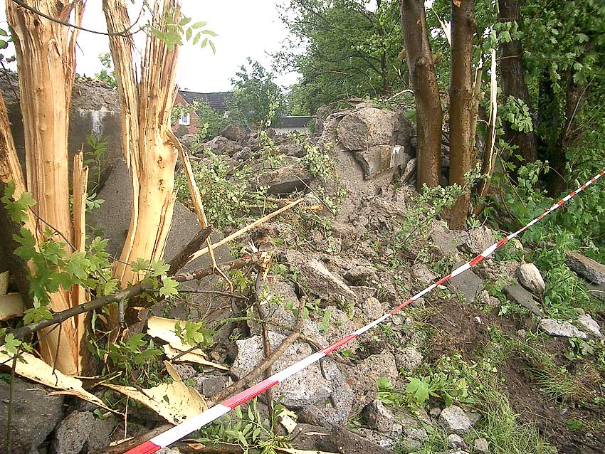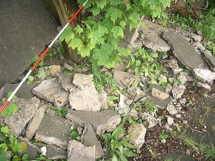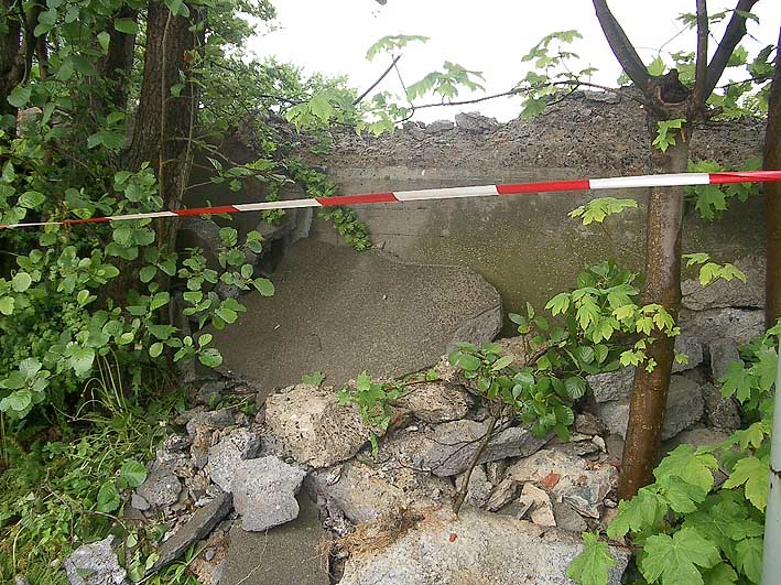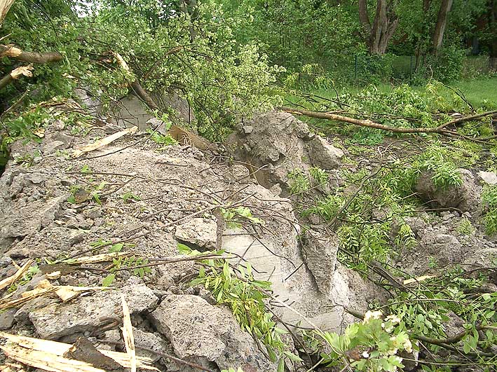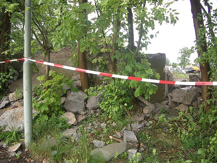 24.05.06: In nur drei Tagen wurde ab Montag bis heute fast der gesamte noch vorhandene Rest des betonierten Deckungsgrabens zerkleinert. Zwei Betonbrockenberge des anfallenden Schuttes sind inzwischen aufgetürmt. Nach den zögerlichen ersten Abrisswochen kann man sagen, dass nun "ganze Arbeit" geleistet wurde. Man sieht wieder einmal, es lag wohl doch nicht an der Technik sondern an anderen "Hürden". Vielleicht war diese Abrissdauer auch geplant. Jedenfalls wird in einigen wenigen Etappen wohl (über Erdgleiche) nichts mehr an den Graben erinnern.