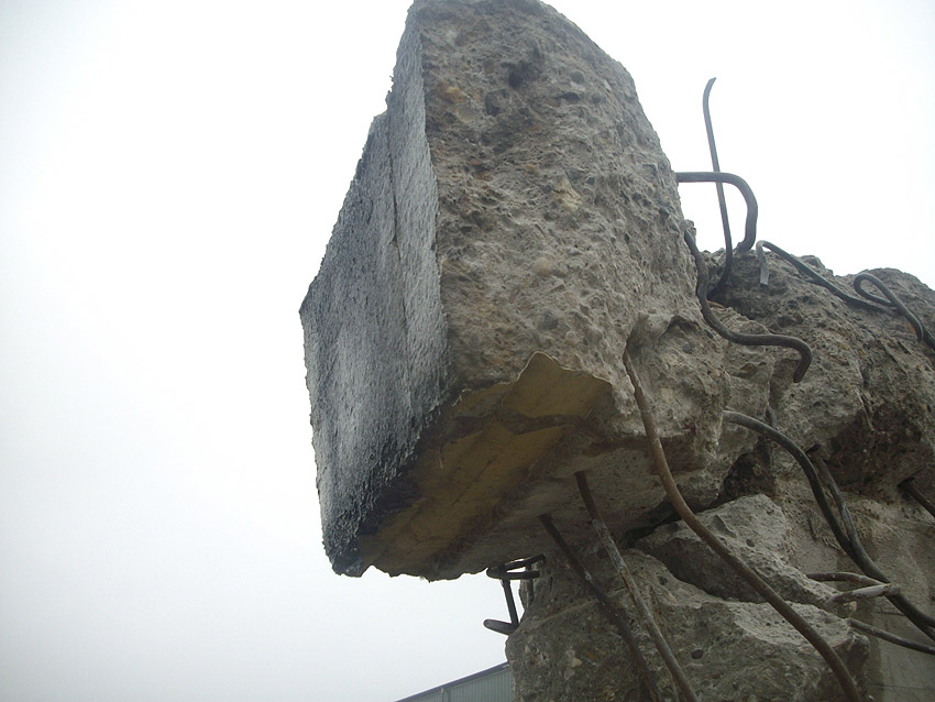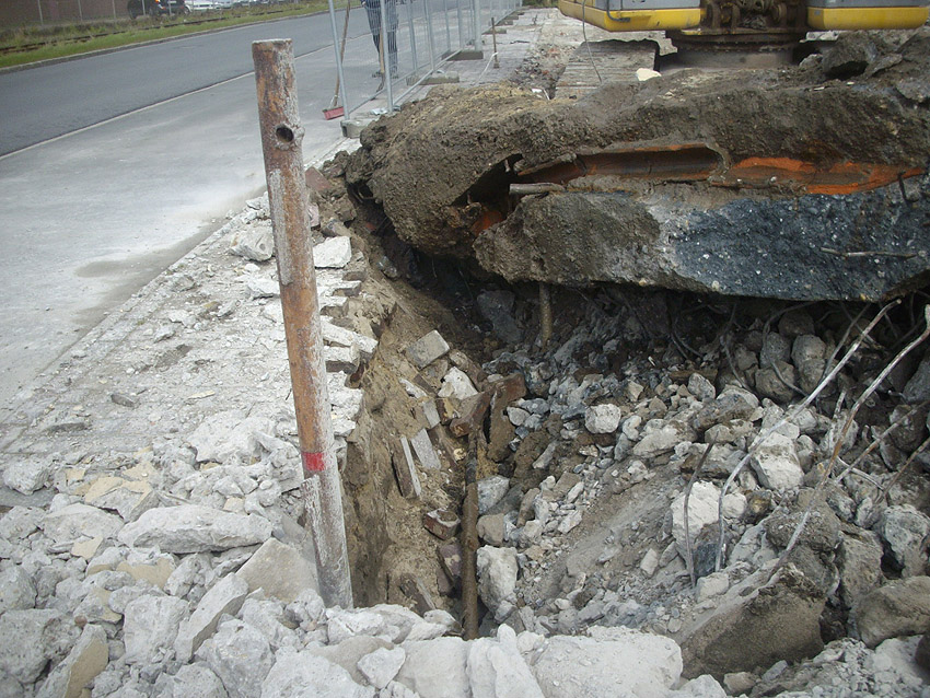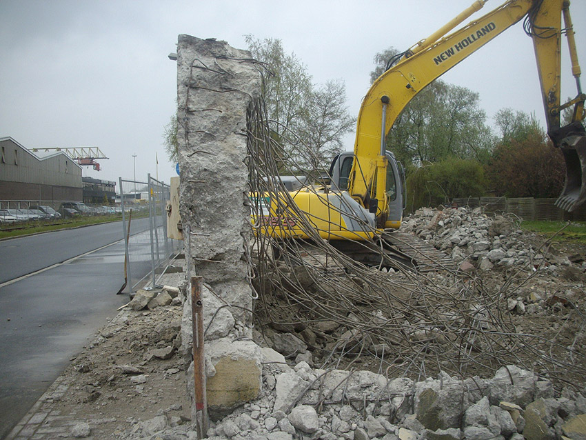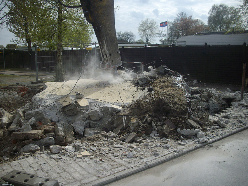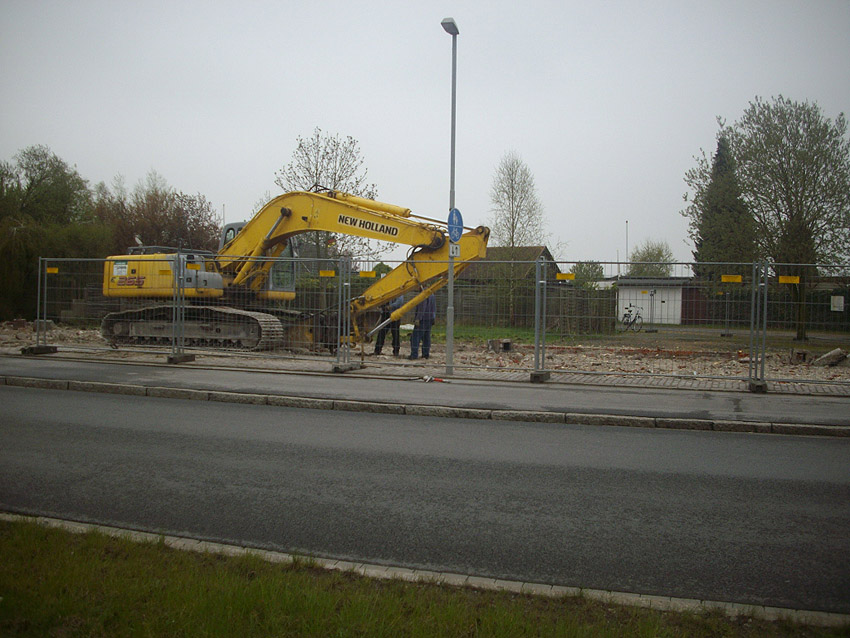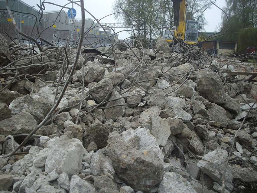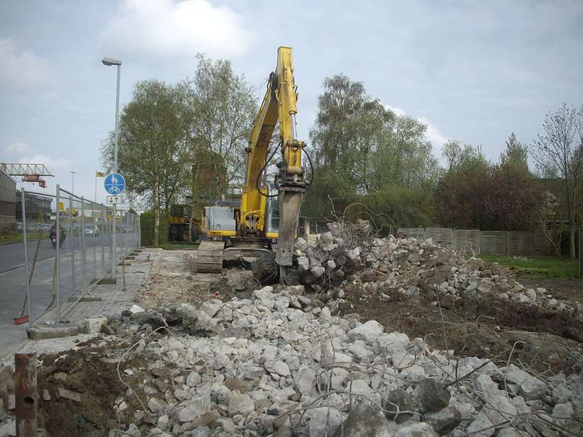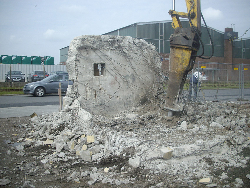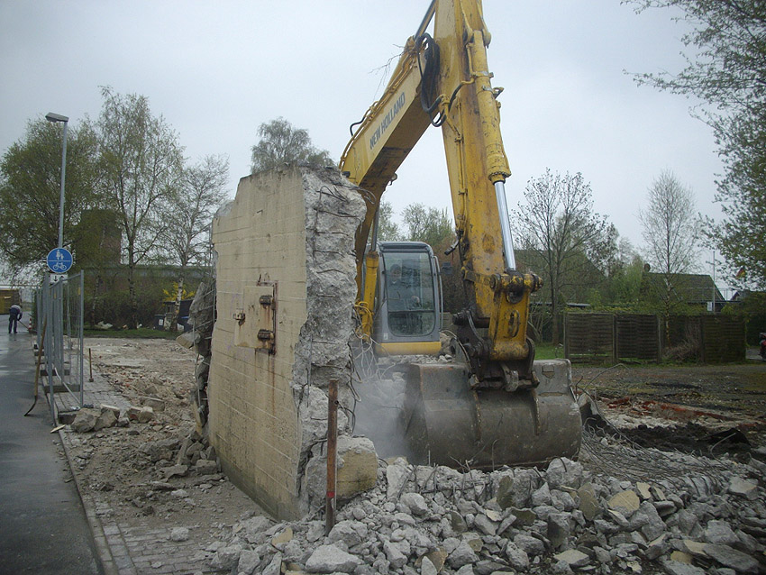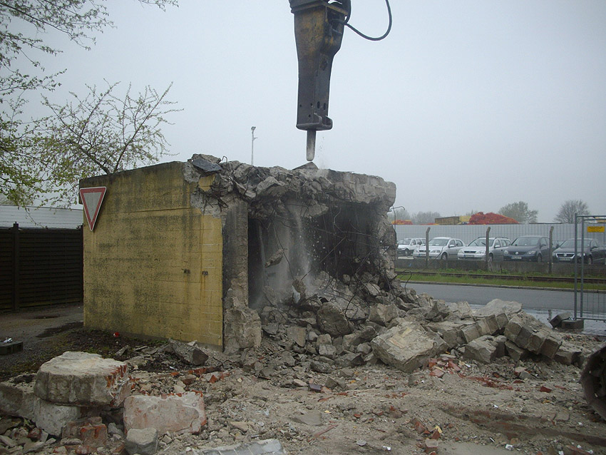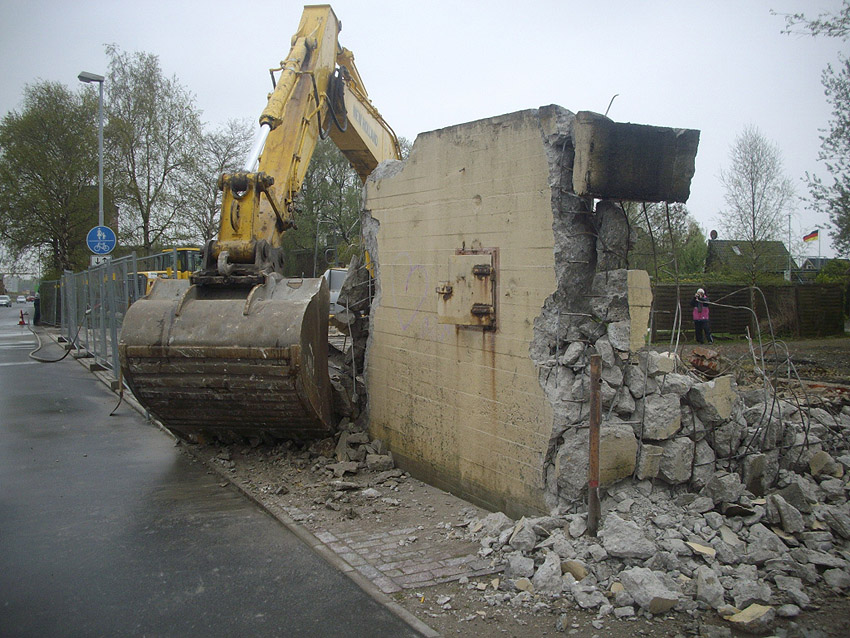 26.04.10: Wie erwartet wurde heute der Bunker abgerissen. Zwischen 13 und 17 Uhr erfolgte die Entfernung des Betonklotzes. Der Bunker erwies sich zäher als vermutet. Engmaschige Bewehrung trat sofort nach Abrissbeginn zum Vorschein. Sie verzögerte die Arbeiten erheblich. Der etwa 4,5 Meter lange, ungefähr 3,5 Meter breite und circa 3 Meter hohe Bunker mit 50 cm starken Wänden und Decke besaß zudem eine massive Fundamentplatte, die an den Kanten eine Tiefe von bis zu 80 cm aufwies. Zum Feierabend war vom Bunker jedoch nur noch ein Trümmerhaufen übrig. Trotz teilweise widrigster Witterungsbedingungen gelang es uns, einige interessante Bilder vom Abriss anzufertigen. Damit gehört auch dieses Bauwerk der Geschichte an. Die nächsten Tage werden noch einige Fotos von der Planierung des Geländes / Trümmerentfernung angefertigt. Aufgrund der 203 Bilddateien ist zum zügigen Betrachten eine DSL-Verbindung erforderlich!