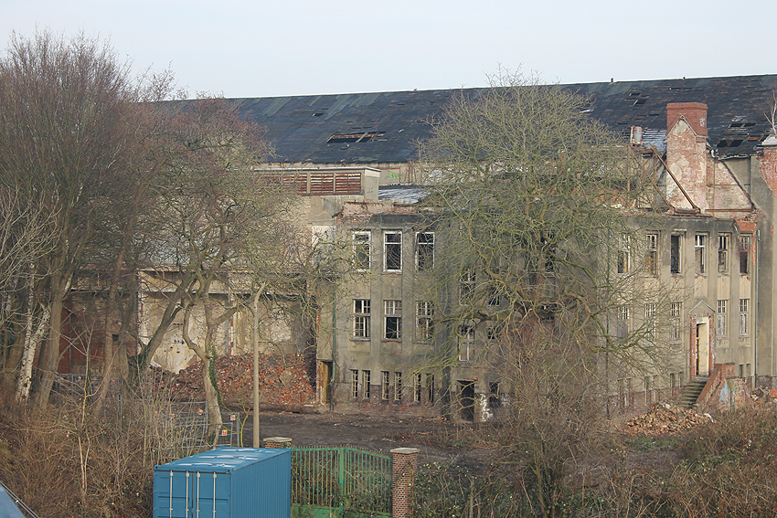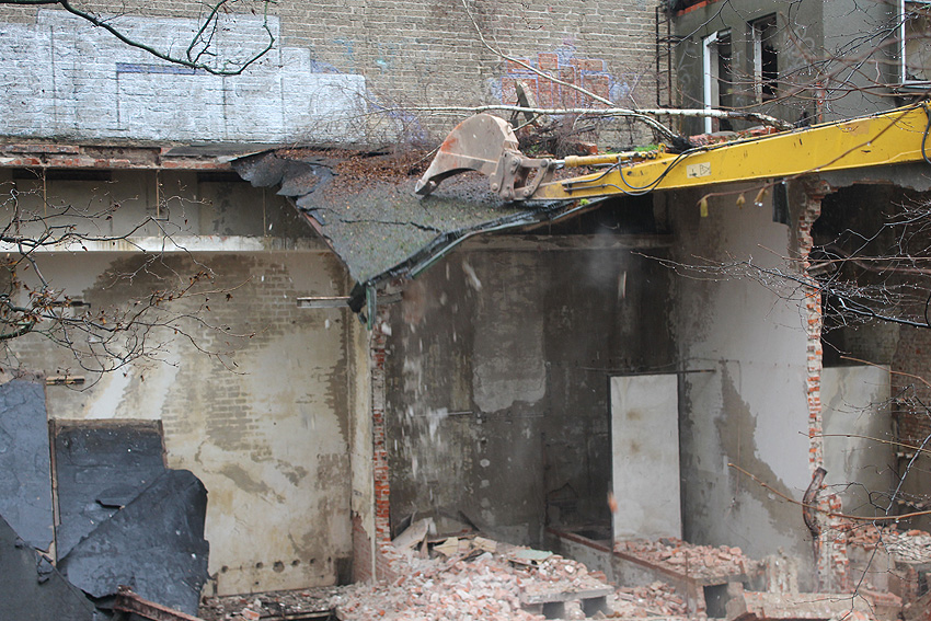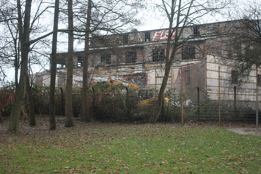 11.12.14: Nun wird im Südbereich direkt neben dem Verwaltungstrakt entkernt und scheinbar auch hier ein Abbruch vorbereitet.