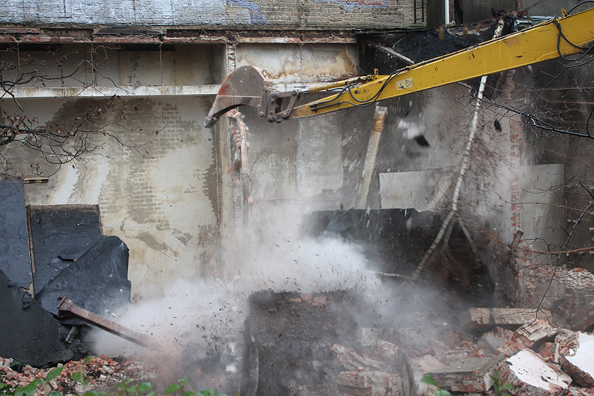 03.12.14: Südzentrale: ABRISS. Heute wurde - wie befürchtet - mit dem Abriss begonnen bzw. der seit Monaten schleichend laufende Prozess der Zerstörung wurde fortgesetzt. Der kleine Anbau nördöstlich an der Maschinenhalle wurde bis auf den Erdgeschosssockel vernichtet. Danach wurde das Unterfangen jedoch wieder gestoppt. Scheinbar sollen nächste Woche noch einmal Gespräche zwischen Verein und Eigentümern stattfinden. Ist das nun das Ende der Südzentrale? In der Tagespresse - Südzentrale: Abriss vorerst gestoppt