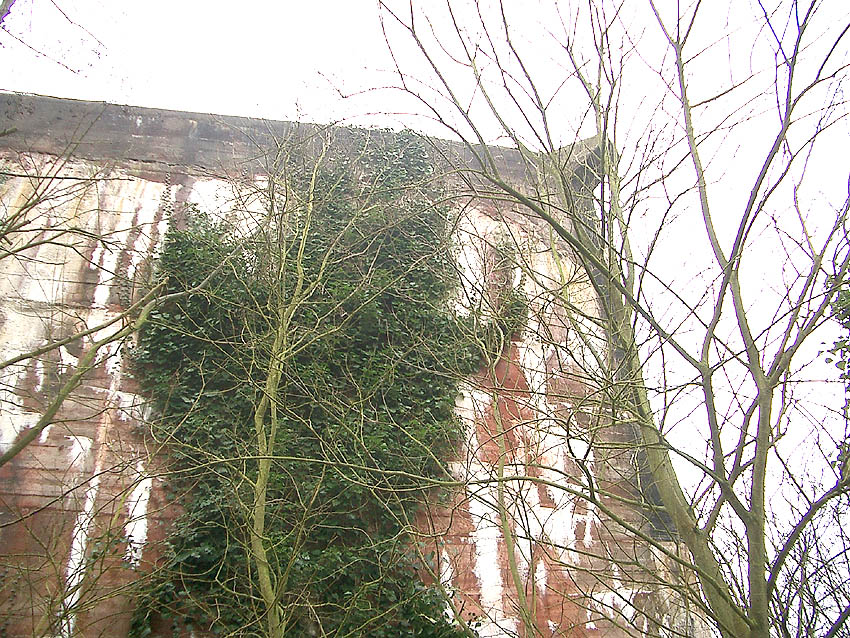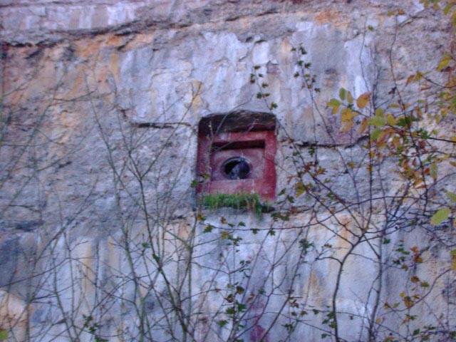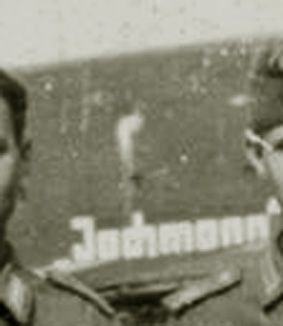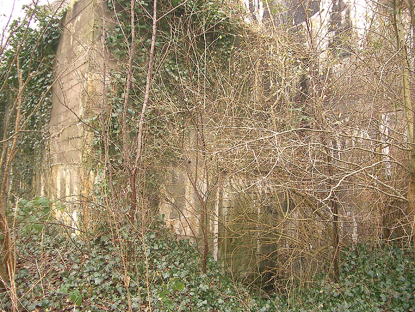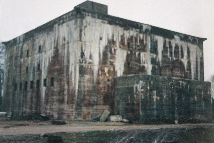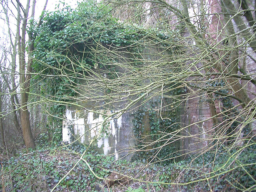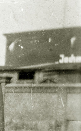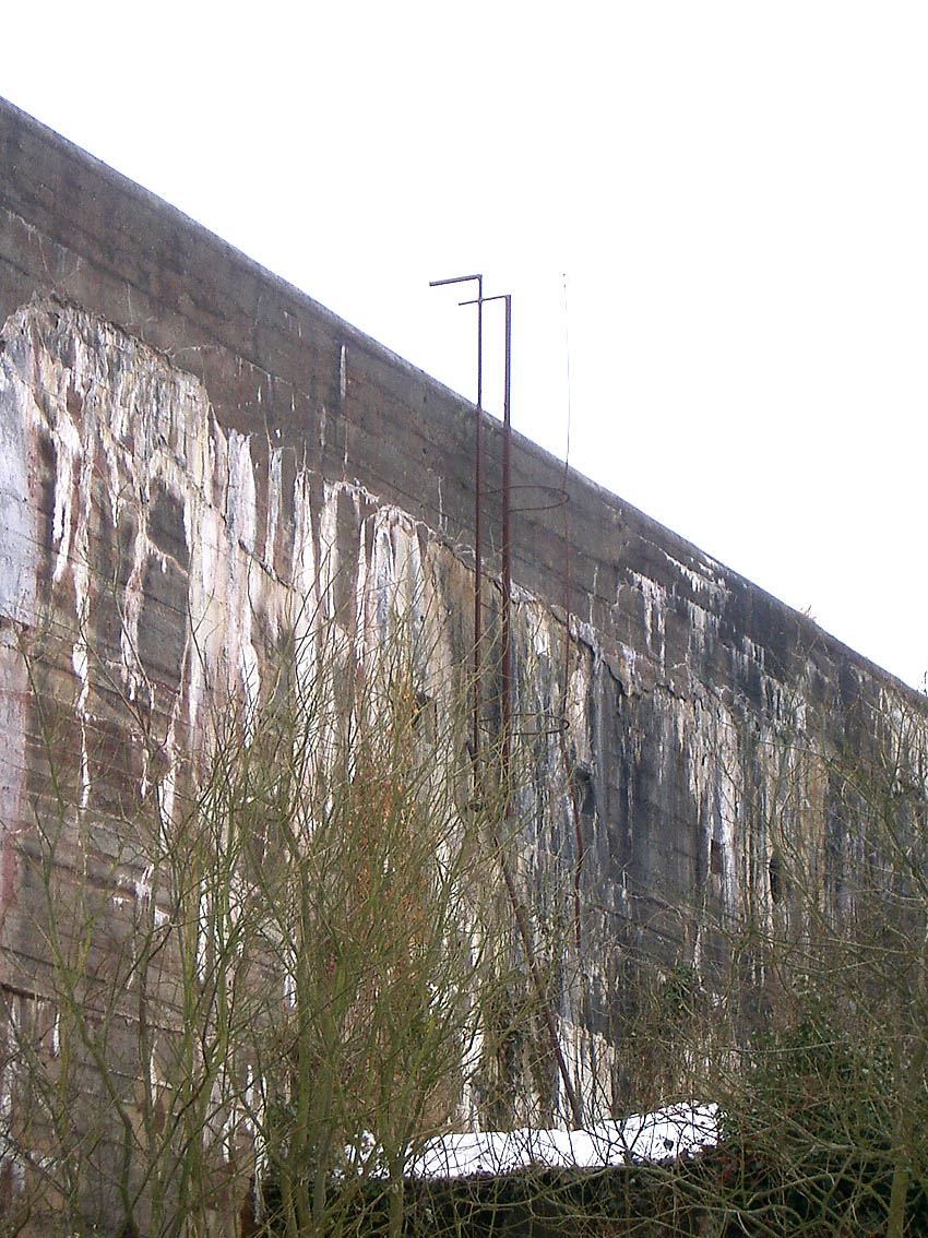 Zusätzlich war am westlichen T 750 an der Westwand über dem Splitterschutzvorbau in großer heller Schrift „JACHMANN“ angemalt worden. Der Schriftzug verblasste nach dem Krieg äußerst schnell wieder. Zu sehen ist zudem, dass der Bunker bereits im Krieg kurz nach Fertigstellung erste starke Ausblühungsstellen aufwies.