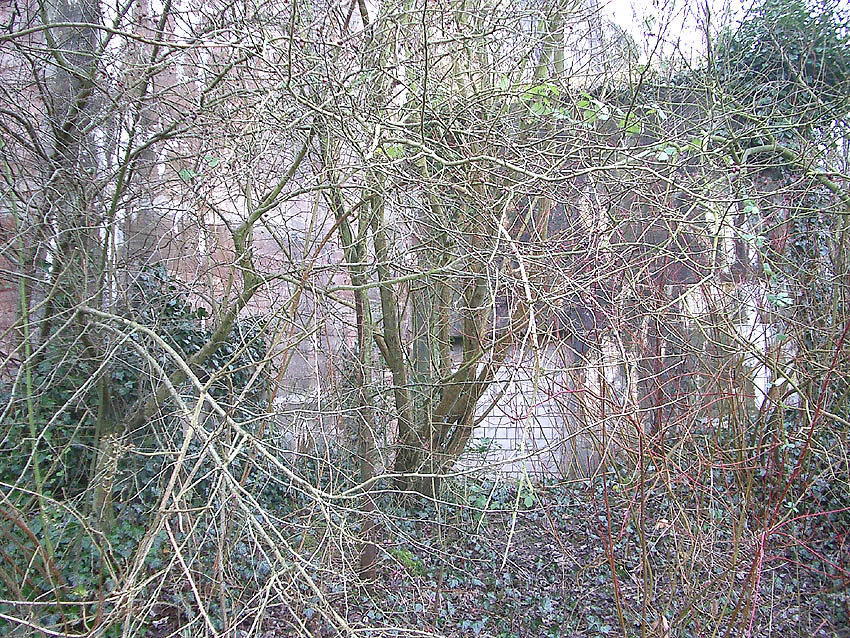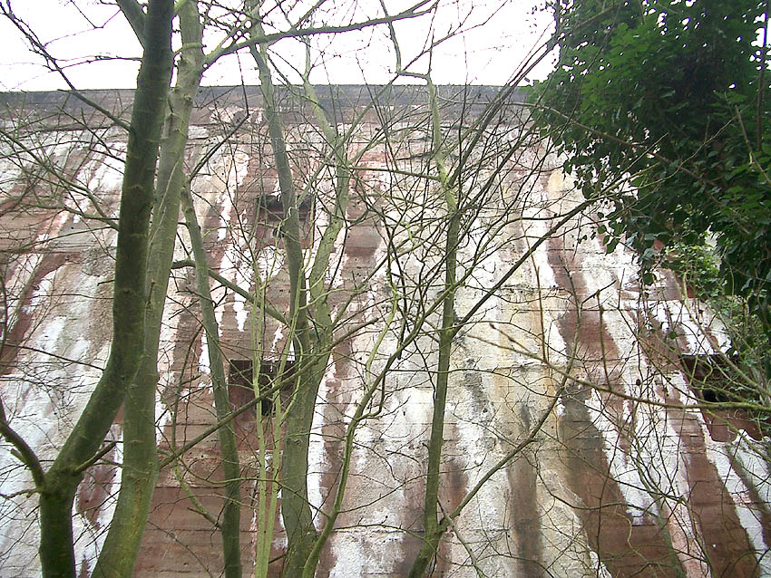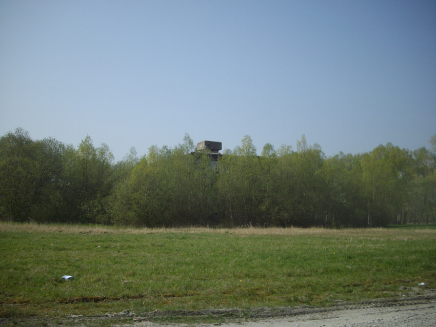 Mittig rechts im Bild hinter dem Kasernengebäude zu sehen der Truppenbunker. Wie auch der Westbunker wird er eine helle Aufschrift an der Westwand an gleicher Stelle besessen haben. Hier gut zu sehen das höchstwahrscheinliche Schriftfeld über dem West-Splitterschutzvorbau. Es wird aber nach dem Krieg schnell wieder verblasst sein. Die Frage ist, was dort stand. "Jachmann" / "Scharnhorst" / "Gneisenau"...?
