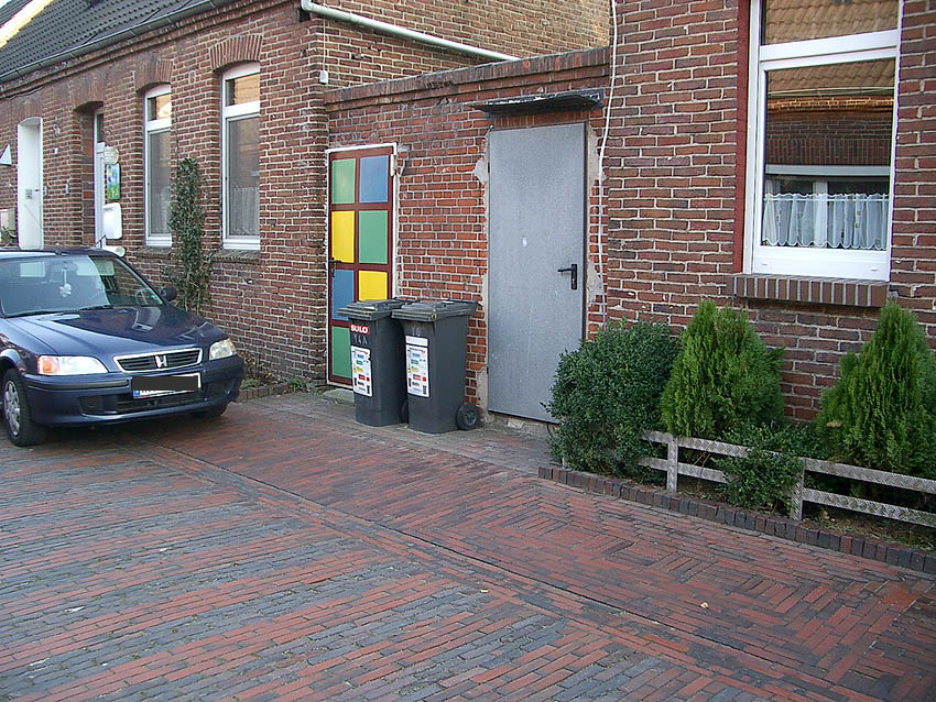Mittlerweile wurde die linke Tür (Nachkriegstür) durch ein Exemplar mit Fenstern ersetzt.