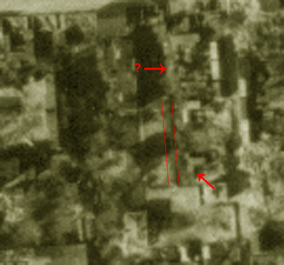 Rechts am Pfeil zu sehen der Rundbunker. Zwischen den Linien der anliegende Herzbruchstollen. Oben am Pfeil mit dem Fragezeichen der vermutete Standort vom zweiten Rundbunker auf dem Schulhof. Laut Zeitzeugin Marlis Raddatz, welche die Grundschule Bremer Straße ab 1953 besuchte, waren die beiden Rundbunker definitiv existent. Sie hatten nichts mit dem Herzbruchstollen auf dem Hof zu tun, sondern waren separate runde Bauten - wie das nahe gelegene Objekt an der Franziskusschule - mit Spitzkuppel. Wenn man aus dem Haupteingang des Schulgebäudes an der Bremer Straße Richtung Osten auf den Schulhof schaute, stand ein Rundbunker links vom Herzbruchstollen und einer rechts (dahinter) / der hier vorgestellte Bunker.