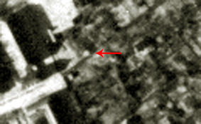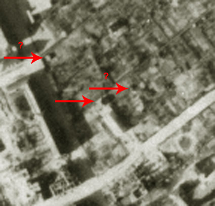 Die Wahrscheinlichkeit ist hoch, dass es sich hierbei um einen kleinen Rundturm wie z.B. diejenigen in der Stadtparkkolonie handelte. Oberes Bild: Was waren dies für zwei Objekte an den mit Fragezeichen versehenen Pfeilen? Das Objekt am Pfeil ohne Fragezeichen könnte der Rundbunker gewesen sein. Unteres Bild: Möglich ist jedoch auch, dass dies der Rundbunker war. Unweit entfernt vom südlichen Deckungsgraben der Grodenschule.