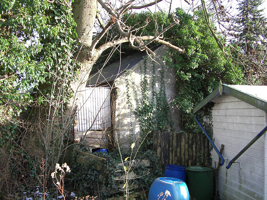 Am Ostende des Schutzraumes sind definitiv ganzwandig durchgehende Verschalungsspuren zu erkennen. Hier endete das Objekt schon immer. Am Westende könnte eventuell (?) ein Durchbruch gewesen sein. Dies ist nicht ganz abwegig. Folgende (jedoch unwahrscheinliche) Theorie: