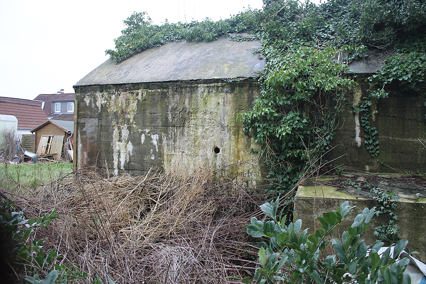 Der Kleinbunker besaß ein Spitzdach mit leicht abgeschrägtem Dachkantenbereich. Hier ergeben sich erstaunliche Ähnlichkeiten zum betonierten Deckungsgraben hinter der Klinkerstraße:
