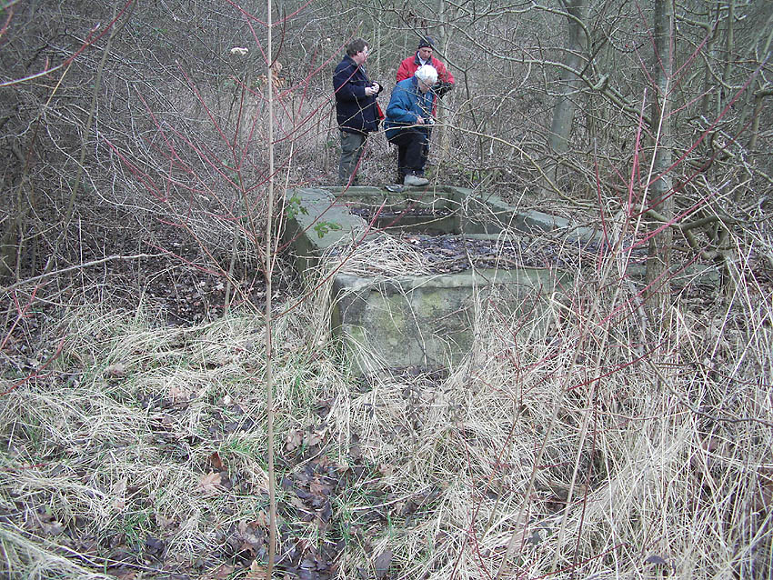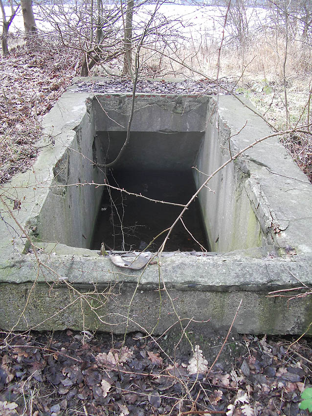 Die Neuentdeckung: Ein unterirdischer Deckungsgraben zwischen Dock V und VI. Zwei Eingänge führen nach unten in die Röhre, die beide Zugänge verbindet. Die Anlage steht unter Wasser.
