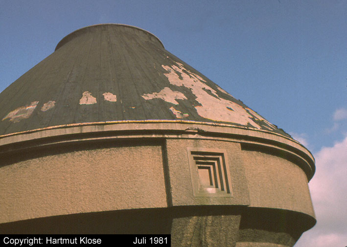 So oder ähnlich könnte der Dietel-Turm im intakten Zustand von nahem ausgesehen haben. Er hatte vier Eingänge, welche ursprünglich mit einem Sandsteinkranz verziert worden waren. Der Turm war äußerlich mit Spritzputz versehen worden. Ob auf der Dachplattform ein Flakgeschütz, ein Scheinwerferstand oder auch nur ein Beobachterposten war, ist bislang unbekannt. Dieser Dietel-Turm war die "zivile" Variante seines Types, die militärischen Sichtscharten / Schießscharten zur Nahverteidigung fehlten. Teilweise waren sie nur angedeutet und verblendet.