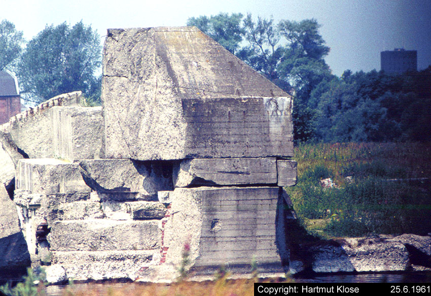 Blick vom gesprengten verbunkerten Dock auf die LS-Turmkuppel Ostkaje...