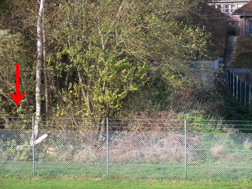 Das wird der Bunkerstandort sein. Links am Pfeil wohl der Eingang mit Treppe...