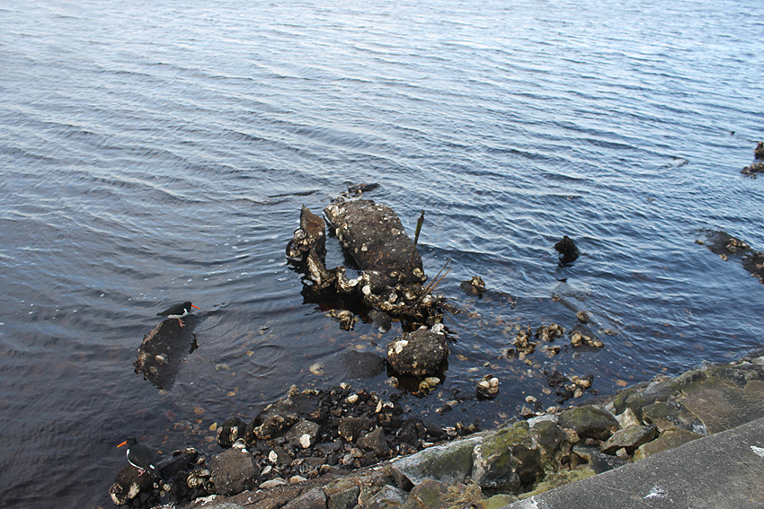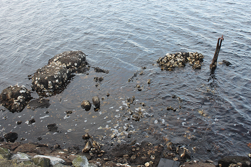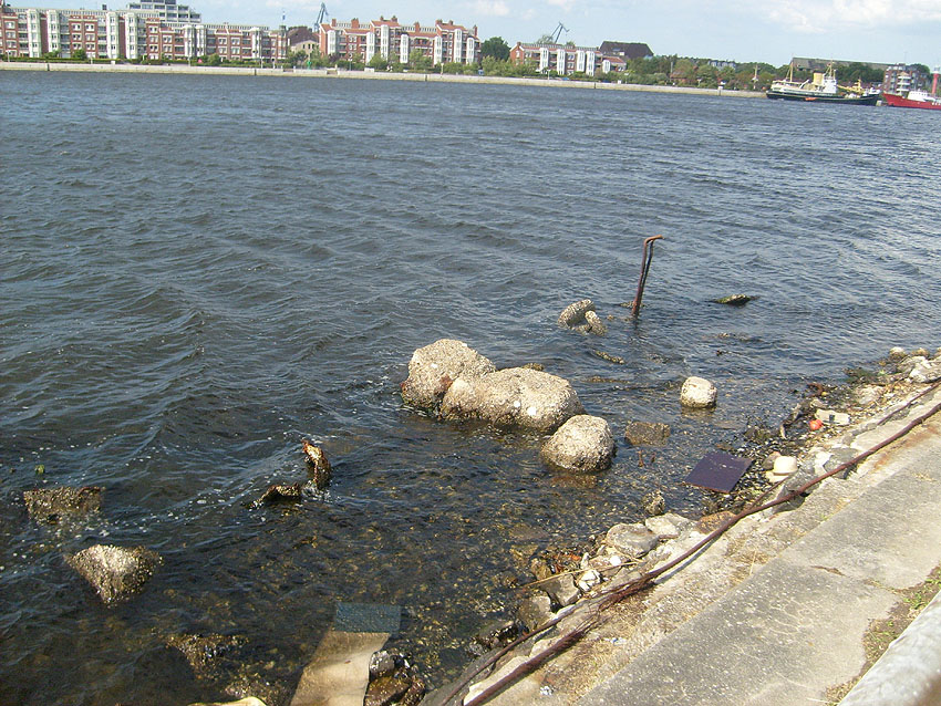 Trümmerstücke der alten Kaimauerbefestigungen / hier war das Westende der 1945 noch existenten Bereiche der Seydlitzbrücke. Eventuell auch einige durch Sprengung hierhin katapultierte Reste vom Bunker, direkt nördlich am Ufer des Hafens. Kurzzeitig im Sommer 2010 erkennbar, da der Hafenwasserstand um circa einen Meter abgesenkt wurde. Leichtsinniges Baden ist hier nicht zu empfehlen...