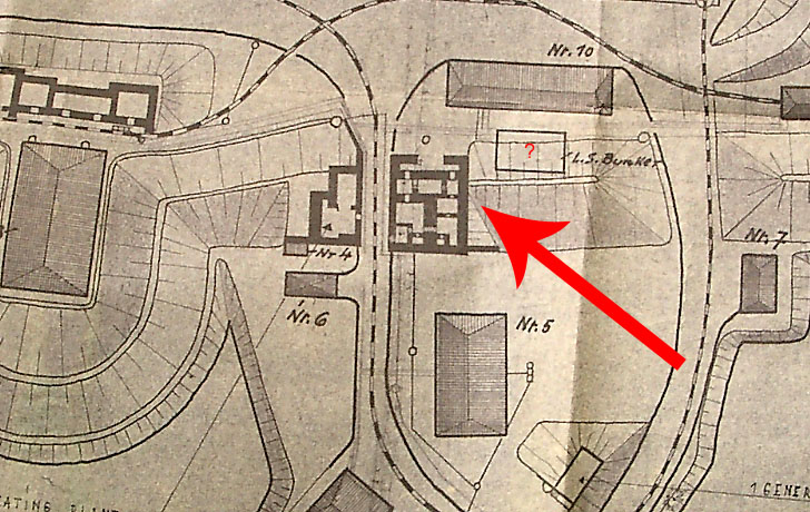 Dieses Objekt auf dem durch die Engländer 1954 reproduzierten Plan vom Fort direkt nördöstlich vom Bunker (Pfeil) ist als LS-Bunker (?) gekennzeichnet. Stand dort eventuell ein zweiter Bunker?