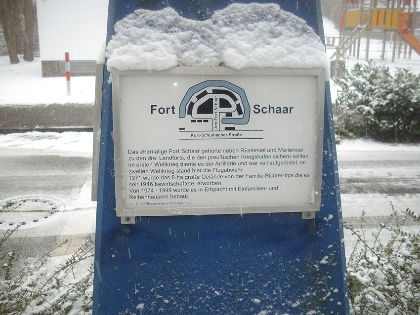 Ab dem Jahre 1876 wurden um Wilhelmshaven herum an der Nordwestflanke drei moderne neue Forts erbaut: Fort Rüstersiel, Fort Schaar und Fort Mariensiel. Alle drei Forts wurden nahe der Maade angelegt, welche im Verteidigungsfall eine feste Frontlinie darstellen sollte. Diese Bunkeranlage auf dem Gelände des Forts Schaar wurde bereits im Ersten Weltkrieg als Schutzraum am Eingangsportal des Forts errichtet. Durchaus könnten die ersichtlichen Bunkertrümmer auch direkt im Verbund mit den ab 1876 im Fort errichteten Kasematten gelegen haben, welche nach dem WK 2 gesprengt und später beseitigt wurden.