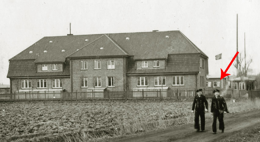 Dieses Bild von 1943 zeigt Splitterschutzvorbauten der Notausstiege und äußeren Eingänge am Gebäude der Funkpeilstation für den dahinter liegenden LS-Keller im Halbkellergeschoss. Nach Hinweisen bestanden diese - massiv - aus Mauerwerk, Hartholz und Beton. Die Vorbauten wurden bald nach dem Krieg wieder abgebrochen. Am Gebäude im Hintergrund zu sehen LS-Klappen an den Fenstern (Pfeil). Das Nebengebäude wurde Anfang 1942 als äußerst massive Verwaltungsbaracke als Erweiterung des Hauptgebäudes errichtet. Zudem existierten auf dem Gelände weitere Baracken. Das ersichtliche Bauwerk existiert noch heute und beherbergt ein Schuhhaus.
