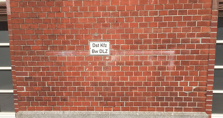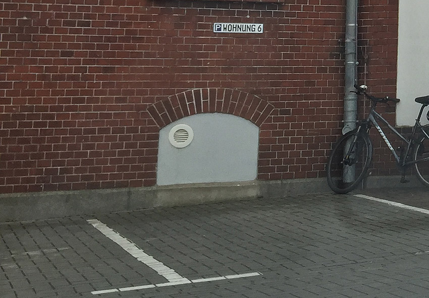 Im Hof der ehemaligen Roonkaserne sind noch weitere Objekte dieser Art zu sehen. Vermauerte Kellerfenster und eine Klappe an der Ostseite des Hofes: