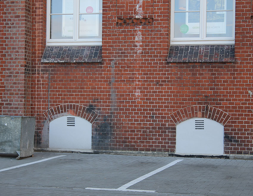 Im Hof an der Nordseite des Gebäudes sind noch immer gemauerte Versiegelungen von Kellerfenstern vorhanden. Diese wurden während der Renovierung der Anlage aufgrund des Denkmalschutzes nicht verändert, lediglich sandgestrahlt, die Fugen teilweise neu verputzt und wie unten ersichtlich mit Lufteinlässen versehen. Hier hinter waren LS-Kellerbereiche. An den Gebäuden der ehemaligen Kaserne Mühlenweg beispielsweise sind auch noch solche Vermauerungen der Kellerfenster vorhanden. Diese wurden beim Neubau des NGW in dem Bereich ebenfalls belassen.
