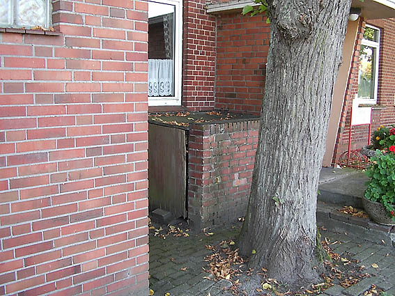 Stand Oktober 2015: Bereits Anfang 2015 wurde aufgrund der Sanierung des Gebäudes der splittergeschützte Eingangsbau beseitigt. Nur noch im Sockelbereich ist der Abstieg ansatzweise erkennbar. Über dem Abstieg liegt eine Holzpalette.