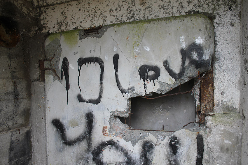 Die Öffnung an der Nordseite des Bunkers schien eine Art Sichtscharte gewesen zu sein. Sie wurde in den Jahren im Innenbereich wahrscheinlich weiter aufgebrochen und befindet sich im Gasschleusenbereich...