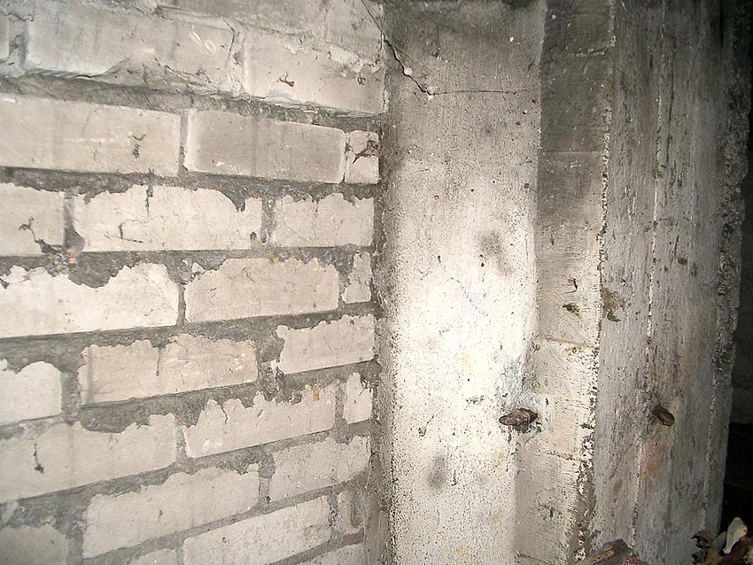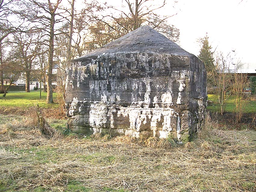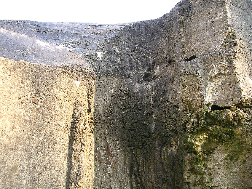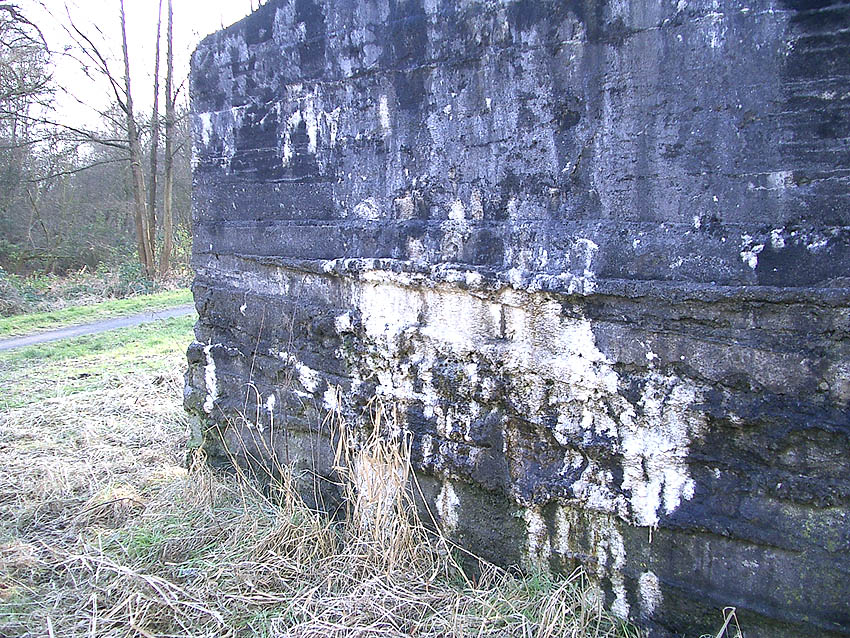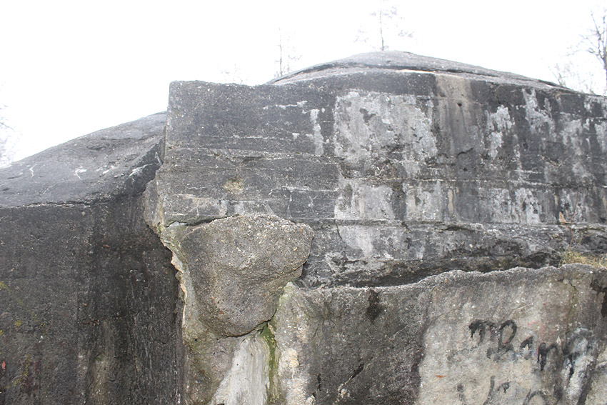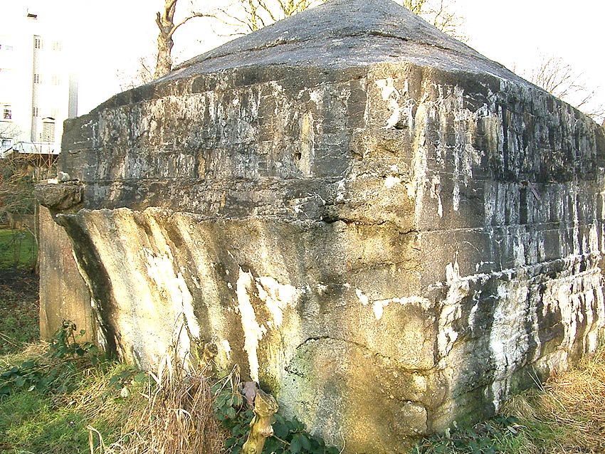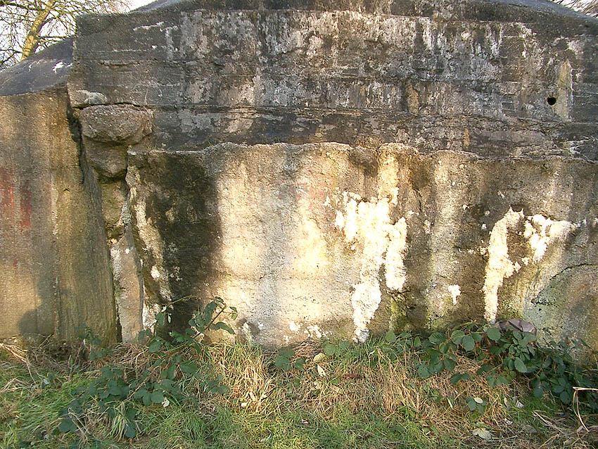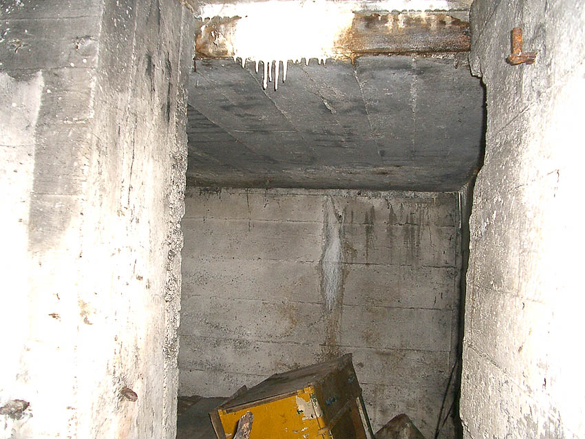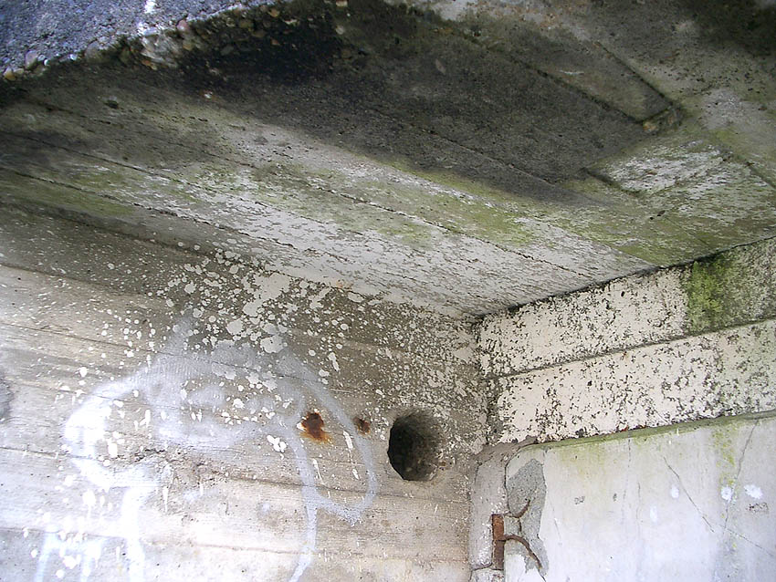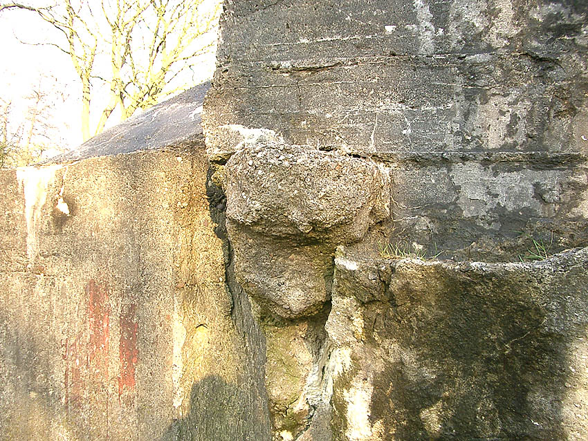 Hier war ein mutmaßlich verbunkerter Anbau in Röhrenbauform angesetzt. Links zu sehen ein runde Aussparung am Bunker in vertikaler Richtung. Dort könnte ursprünglich eine Art Rohr positioniert gewesen sein...