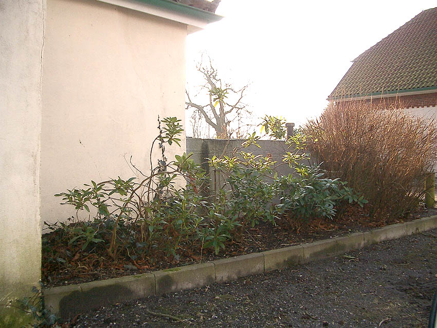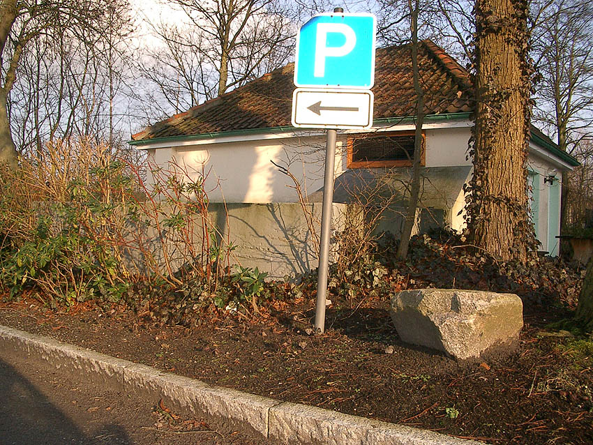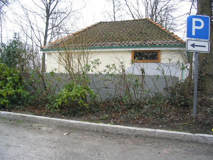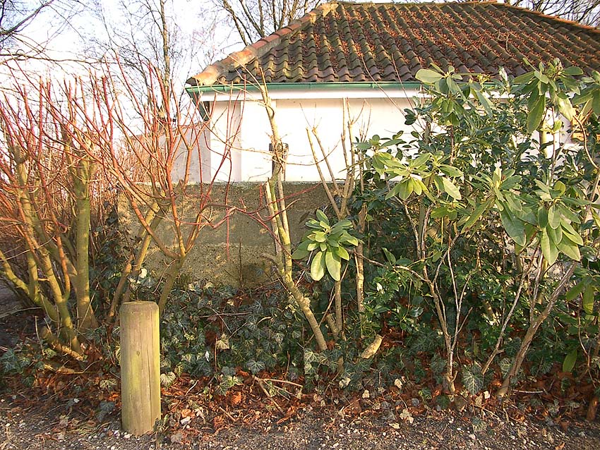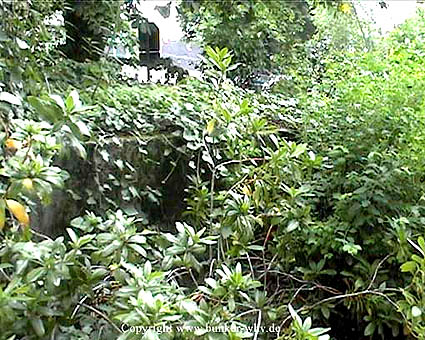 Der Bunker ist direkt an das hintere Gebäude angesetzt. Vom Gebäude aus kann er betreten werden. Das Gebäude wurde erst nach dem Krieg an den Kleinbunker angebaut. Rechts am Gebäude ist der Eingangsabstieg zu sehen. Interessanterweise wurde der Bunker vor einiger Zeit zusammen mit der Neuanstrichmaßnahme des Gebäudes dezent betongrau nachgestrichen und sieht damit praktisch "wie neu" aus.