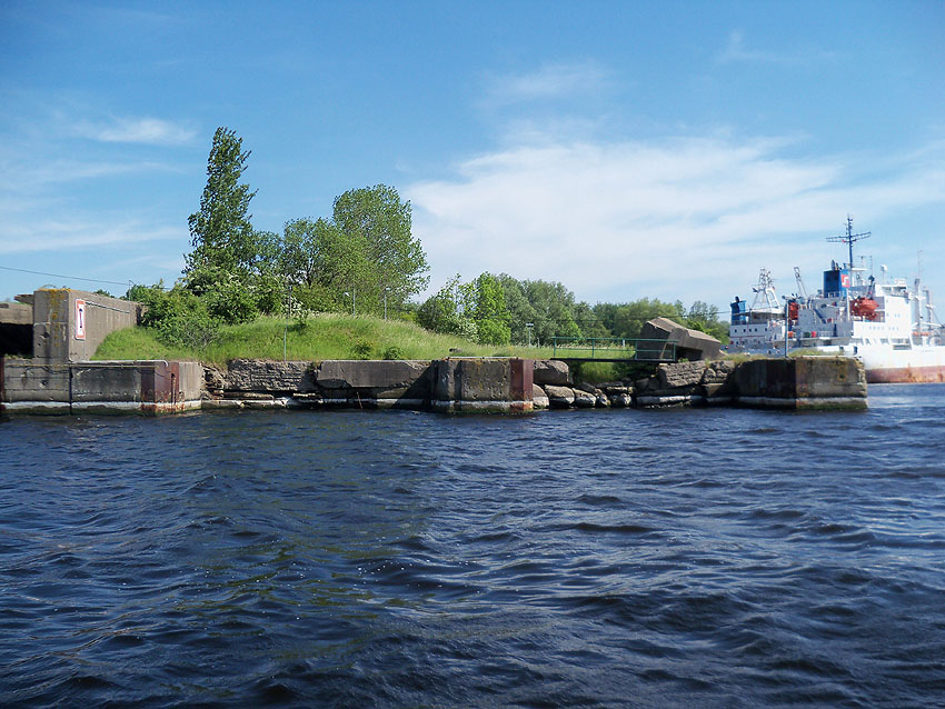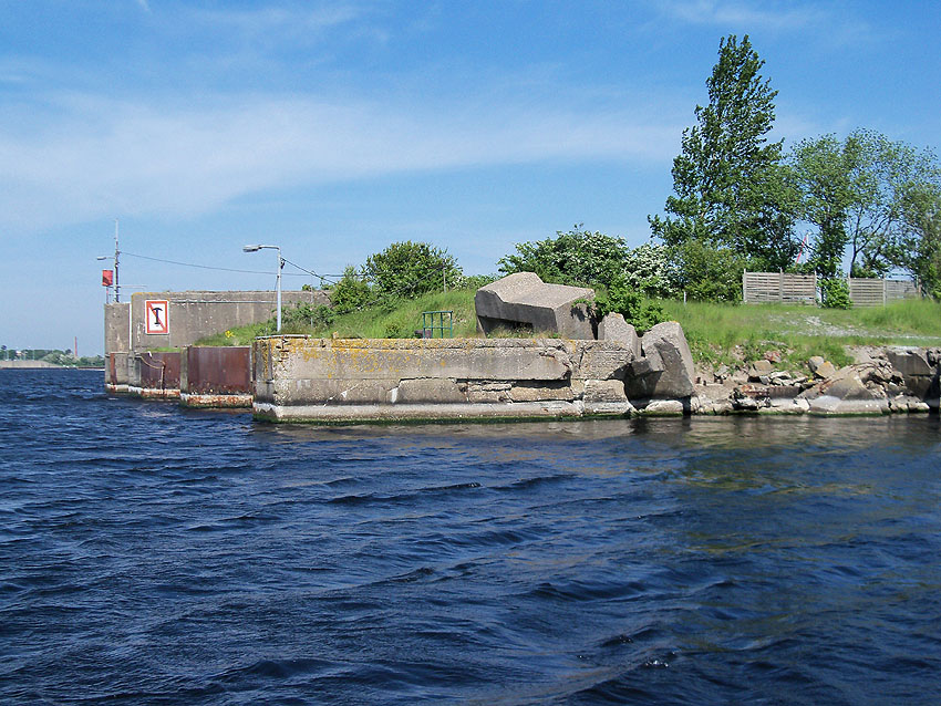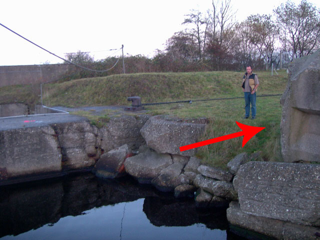 Bei dem mutmaßlichen Beobachtungsstand könnte es sich auch lediglich um ein herausgesprengtes Betonsegment des Hafentores handeln, dessen Öffnung eventuell zur Aufnahme von Leinen von Schiffen vorgesehen war...