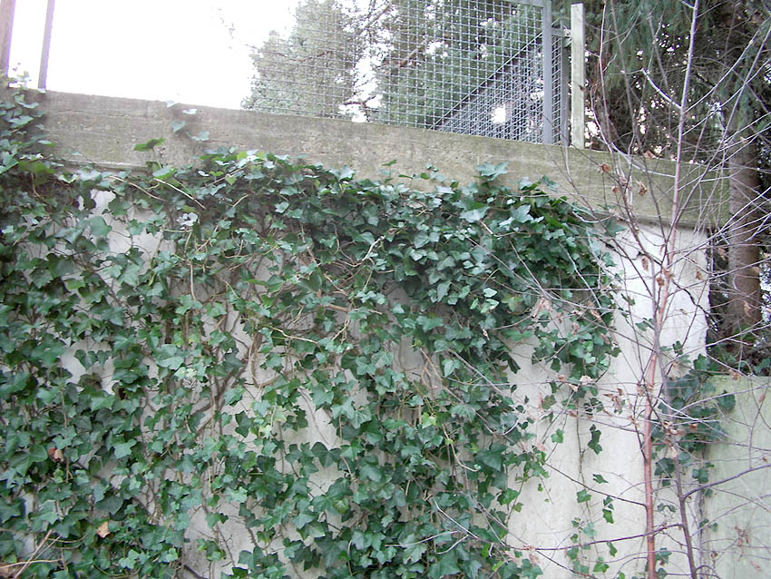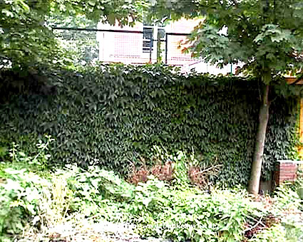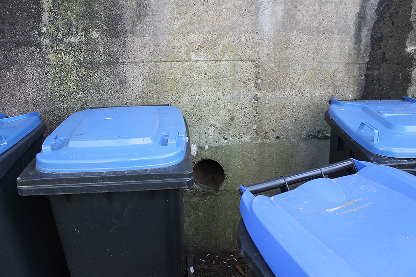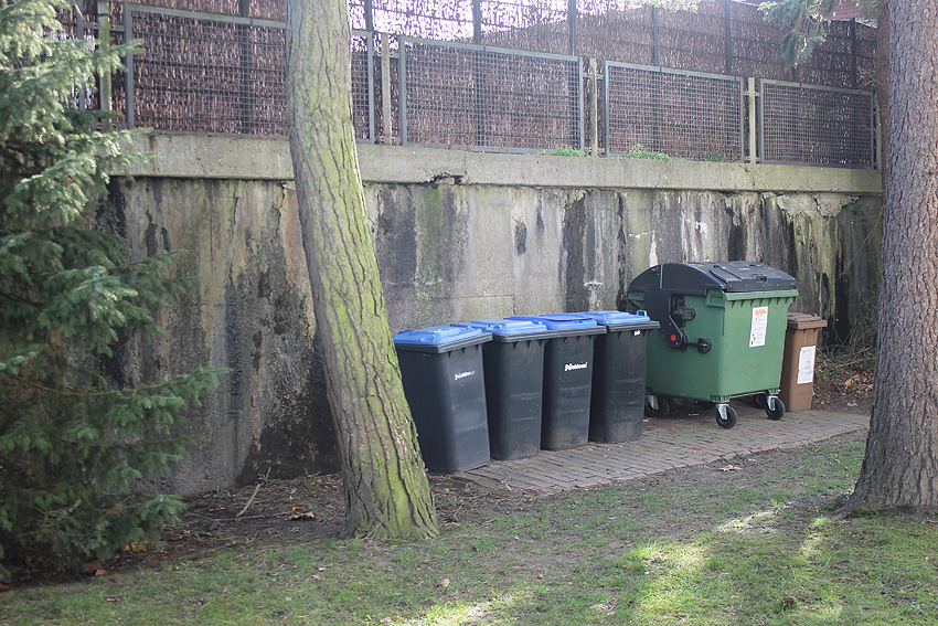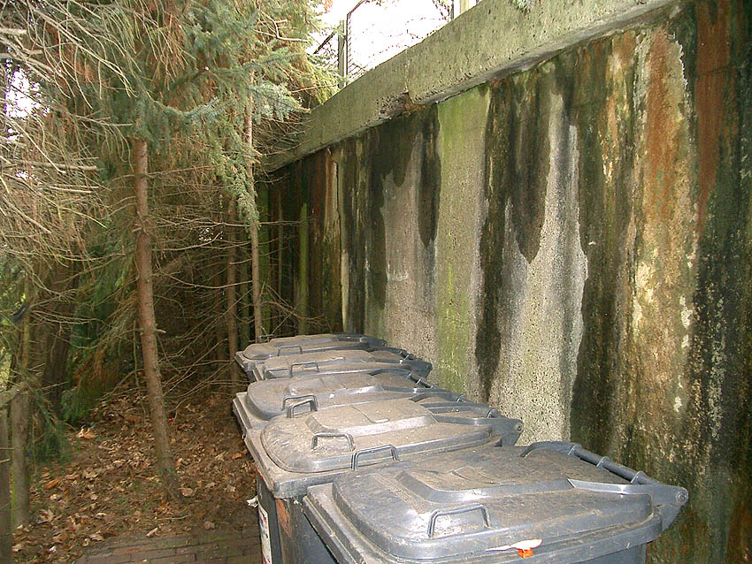 Die weisse Wand links gehört zum unmittelbar neben dem Bunker befindlichen umgebauten Hochbunker Rheinstraße 114.