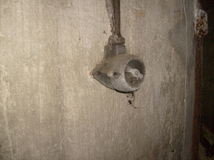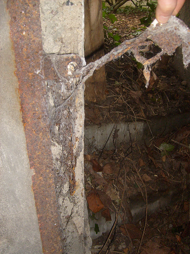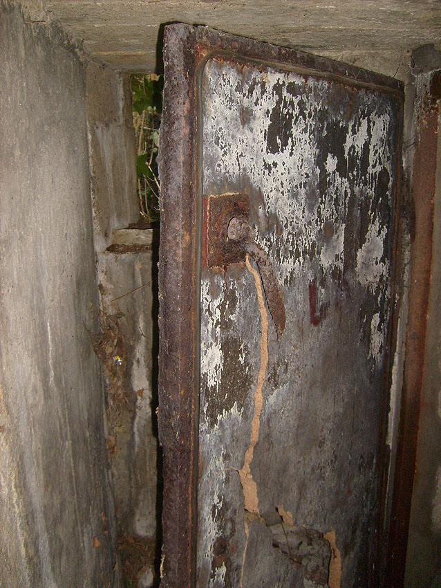Die Tür besteht (wie bei vielen weiteren Oldenburger Rundschutzbauten) aus dem gleichen beton-artigen Verbundmaterial (eine härtere Version ähnlicher Zusammensetzung wie die heutige Gipsverbundplatte), wie z.B. jene Türen in den Gasschleusen der Wilhelmshavener Kriegsmarine-Truppenbunker gefertigt wurden. Stahl war bereits Mangelware. - Dieses Material, das ursprünglich extrem belastungsfähig war, ist günstiger / leichter zu beschaffen bzw. herzustellen gewesen.
