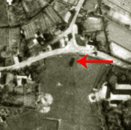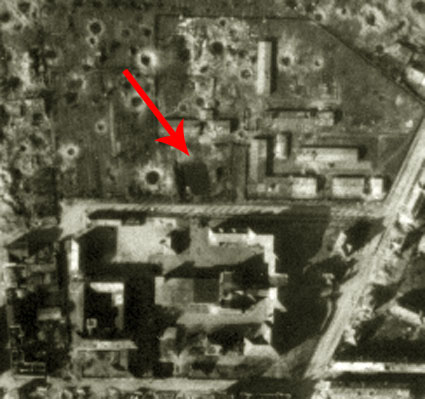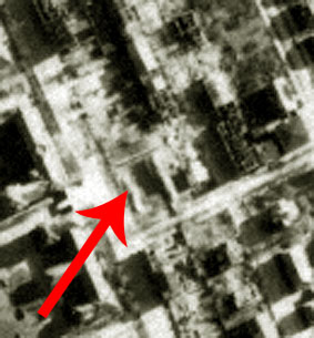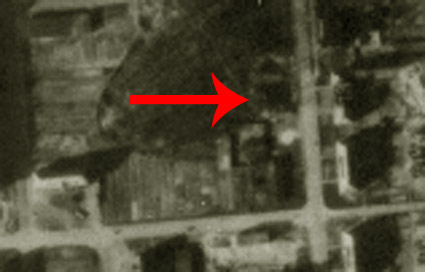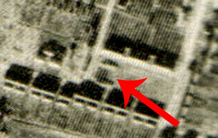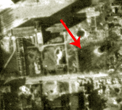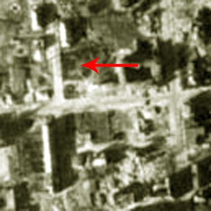 Bemerkung: Der Teich sieht auf dem Luftbild kleiner aus, als in der ursprünglichen Bezeichnung mit Fassung aufgeführt (700 Kubikmeter...). Er wird also daher wohl nachträglich verkleinert worden sein. Unwahrscheinlich, aber nicht ganz ausgeschlossen ist zudem, dass der Teich weiter unten im Bild im Bereich des dortigen LS-Turmes Hunrichsstraße lag. Eventuell wurde er beim Bau des Bunkers entfernt? Was das Objekt am Pfeil dann wiederum in dem Fall darstellte, ist unklar. Bis dato wird jedoch davon ausgegangen, dass das Objekt am Pfeil der wohl nachträglich verkleinerte Feuerlöschteich war.