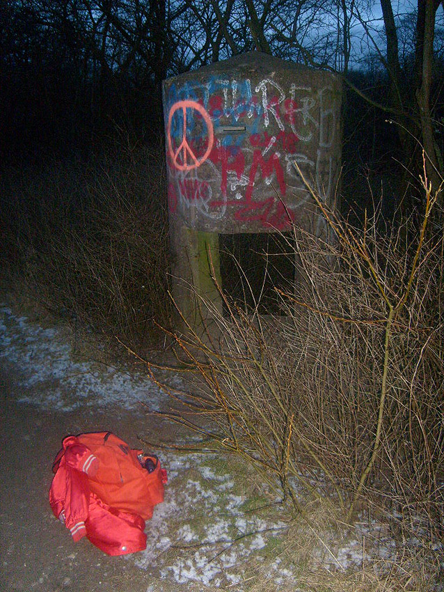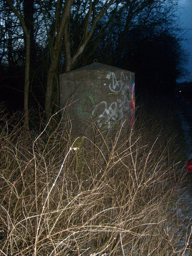 Im Rahmen unserer Flensburg-Tour vom 17. / 18.03.18 konnten wir bei sehr widrigem Wetter kurz vor Einbruch der Dunkelheit dennoch einige Aufnahmen der wohl nördlichsten noch erhaltenen Splitterschutzzelle Deutschlands am Bahnhof Flensburg anfertigen. Die Schutzzelle, deren Türen nach dem Krieg aufgrund der Demilitarisierung entfernt wurden, steht auf einem quadratischen Fundamentsockel etwa 200 Meter südöstlich des Bahnhofsgebäudes - südlich der Schienen - nahe der Valentinerallee. Sie ist eine Zelle des Typs DYWIDAG.