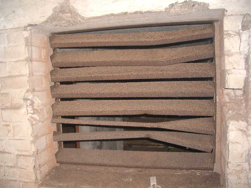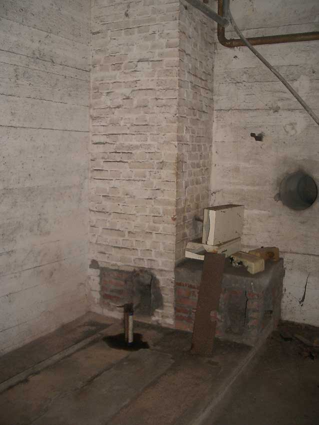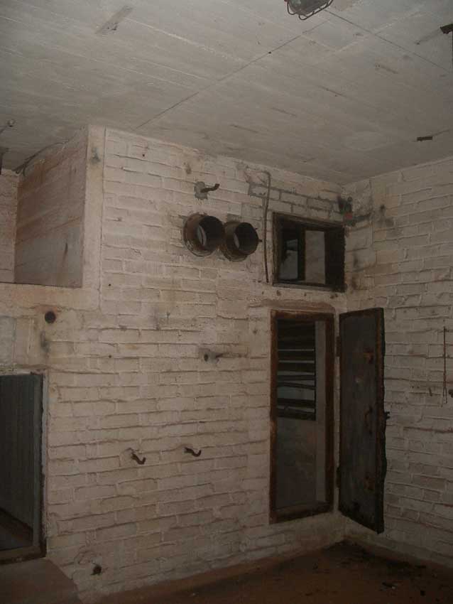 Anmerkung: Bei diesem Tank handelt es sich um ein offenes Ausdehnungsgefäß. Es gehörte zur Heizungsanlage und stellte den höchsten Punkt dar. Es wurde Wasser aufgefüllt, bis der Behälter überlief. Das sich beim Aufheizen ausdehnende Wasser tropfte aus dem Überlauf. Im Betrieb stellte sich ein bestimmter Pegel ein. Von Zeit zu Zeit musste verdampftes Wasser wieder ergänzt werden. Man erkennt sehr gut die drei Anschlüsse: Vorlauf, Rücklauf und Sicherheitsüberlauf. Alle Truppenmannschaftsbunker besaßen in der obersten Ebene diesen Tank.