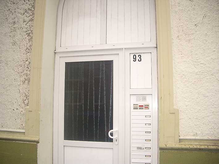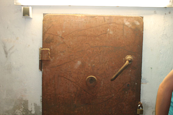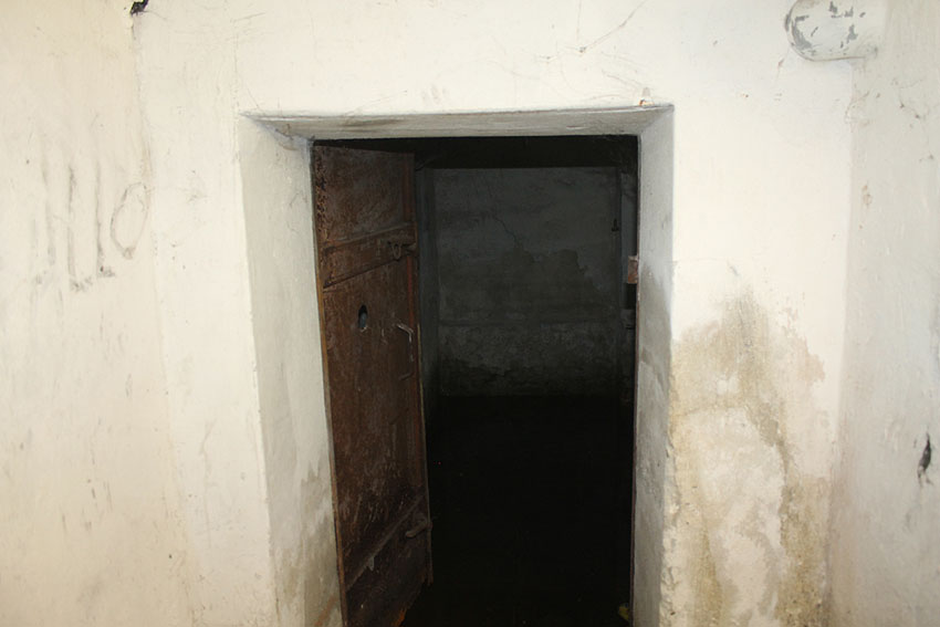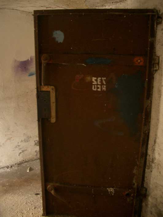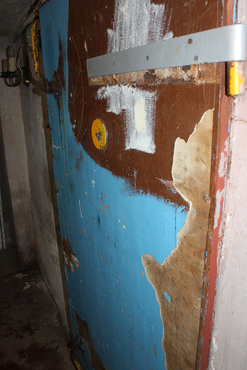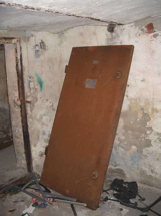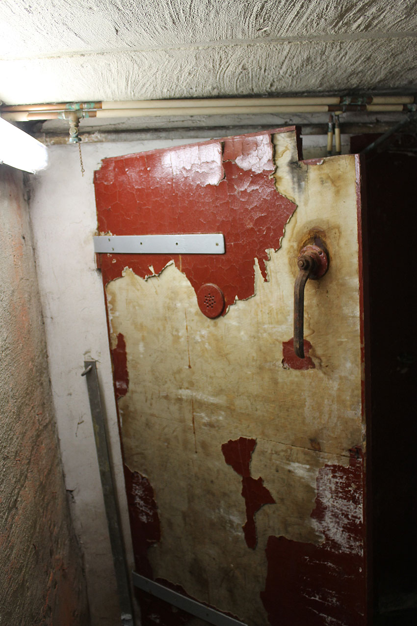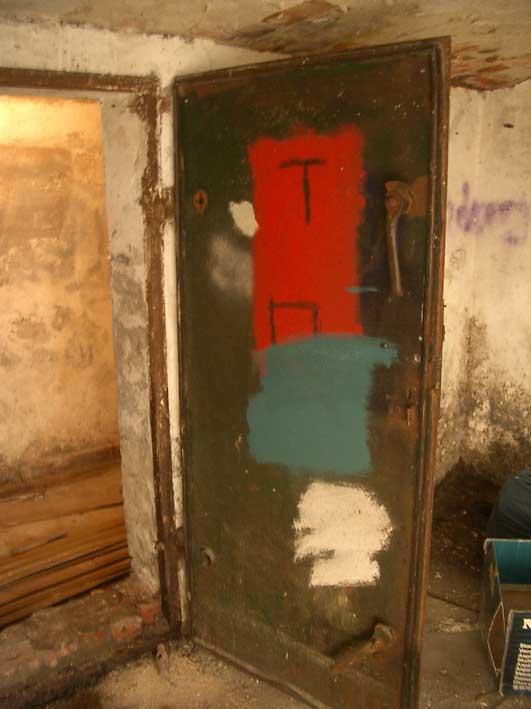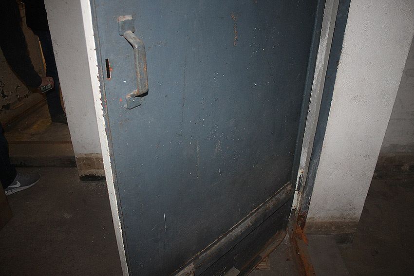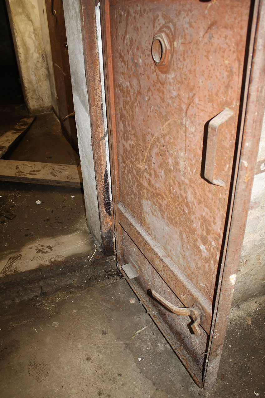 Heutiger Bestand (Stand September 2017): Neben dem in der Aufnahme erkennbaren Schriftfeld ein Soll-Mauerdurchbruch zwischen beiden Häusern und zwei noch vorhandene Druckschutztüren.