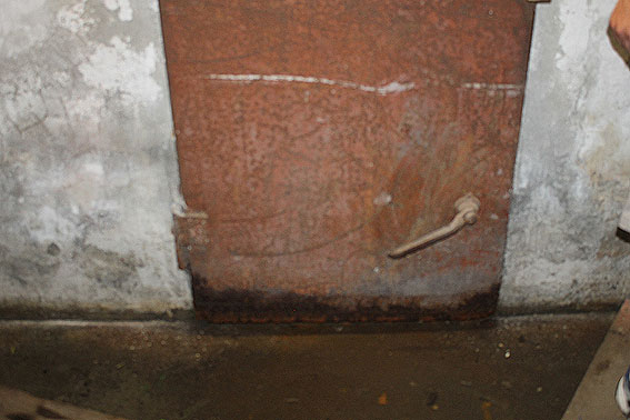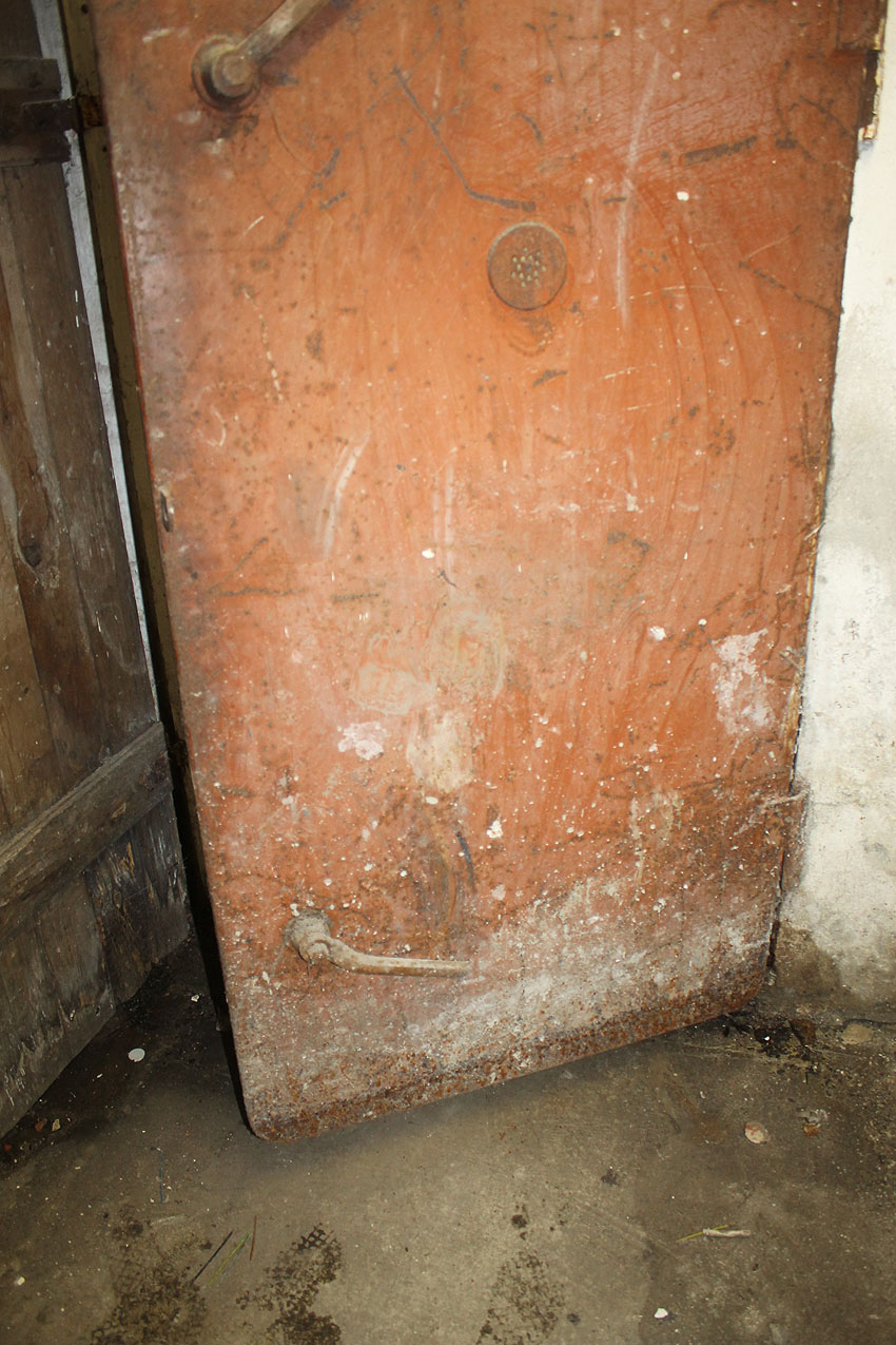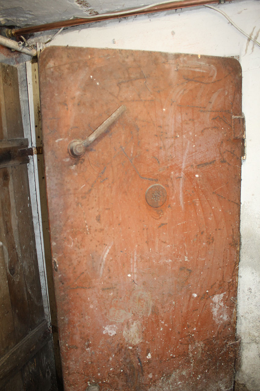 Verschlossene Tür / dahinter äußerlich am Kellerfenster angebrachte Stahlklappe: