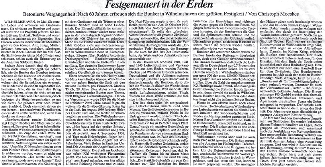 Presseberichte Bunker Wilhelmshaven Wir danken insbesondere der Wilhelmshavener Zeitung für die wohlwollende Berichterstattung bezüglich der Bunkerthematik. FAZ 07.05.05: