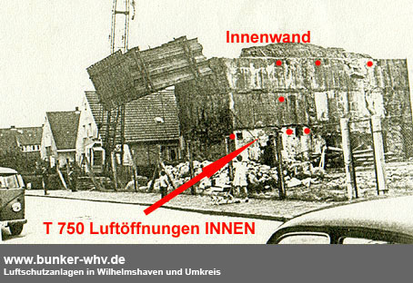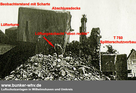 Auf diesem Foto (früh nach der Sprengung aufgenommen - der linke Beobachtungsstand ist später von selbst oder durch Zusatzsprengung nach innen geklappt) ist der linke Beobachtungsstandaufbau mitsamt Sichtscharte und Zugangstür / Notausgangstür vom Dach zu erkennen, zusätzlich der zweite auf der ehemaligen "rechten" Dachecke des Bunkers. Links am Dachbereich das typische Lüftungsloch "Oben Links" des "T 750 Gesichtes". Es muss jedoch aufgrund seiner späten Bauzeit davon ausgegangen werden, dass der Bunker über keine Luftschachtvertiefungen verfügte, und so eher dem Emder T 750 an der Nesserlander Straße, als Beispiel, glich. Der Pfeil "Gekippt" zeigt auf das Lüftungsschachtloch "Oben Rechts" - gekippt durch Sprengung. Eindeutig zu erkennen der Lüftungsturm! Das T 750-Dach schien einen leicht hervorgehobenen Simsbereich gehabt zu haben, wie links oben unter dem Beobachtungsstand an der Dachkante zu erkennen ist... Da dies der Bereich der Deckenverstärkung war, kann es auch sein, dass sie durch die Sprengung nach außen gedrückt wurde.