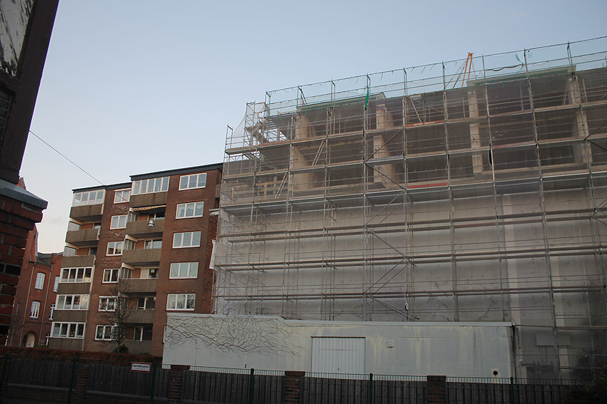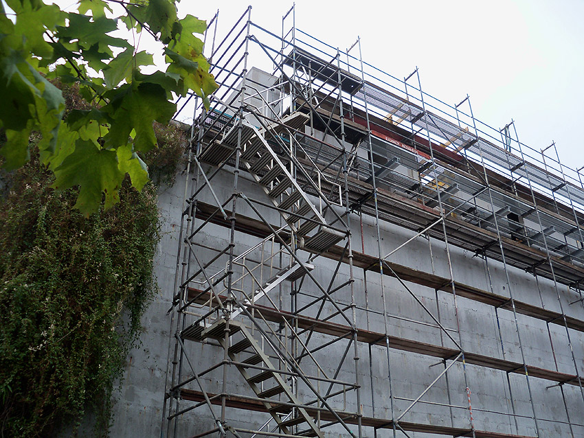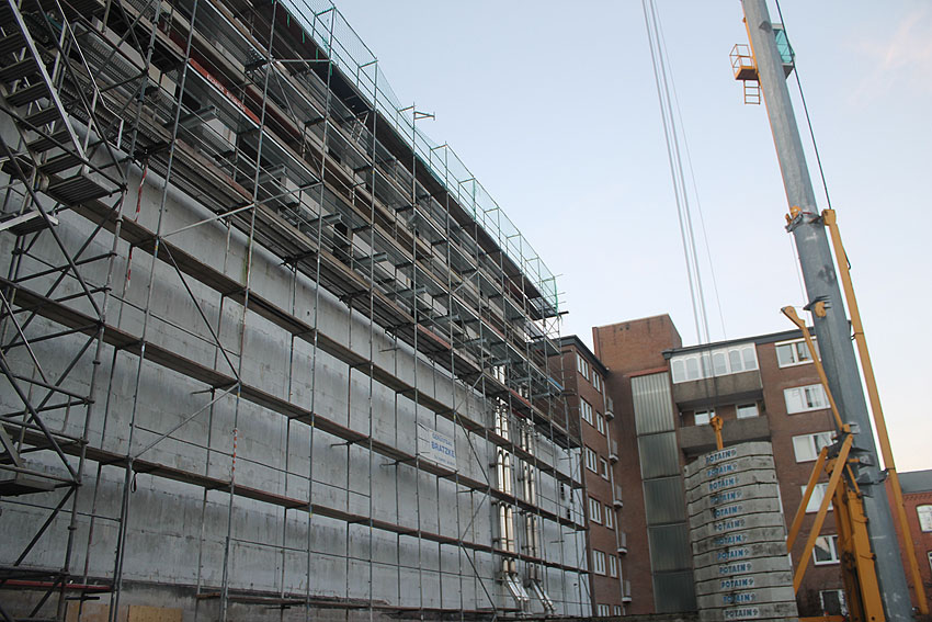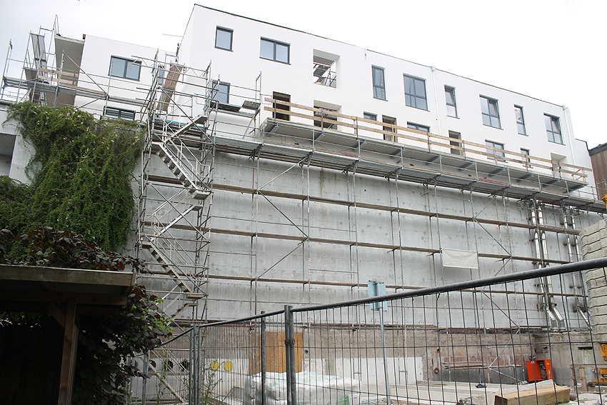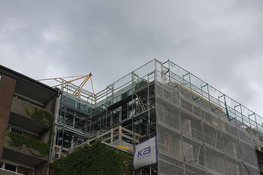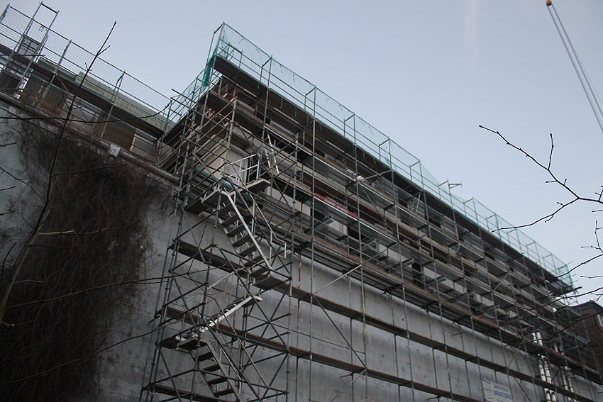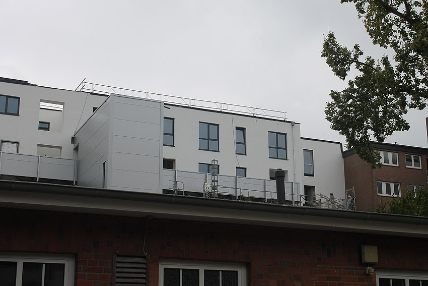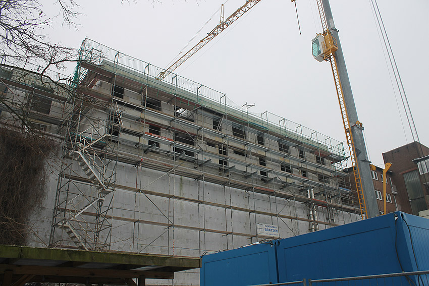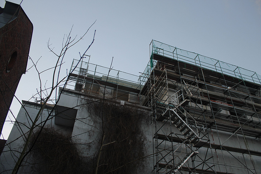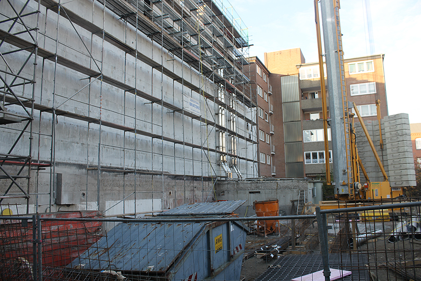 Am ehemaligen OP-Bunker Virchowstraße wird nun an der rückwärtigen Ostwand der Treppenhaus- und Fahrstuhlanbau für die aufgebauten Wohnungen errichtet. Wo genau der Fahrstuhl installiert wird, ist uns allerdings noch etwas unklar. Die Arbeiten gehen stetig weiter ihrer Vollendung entgegen.