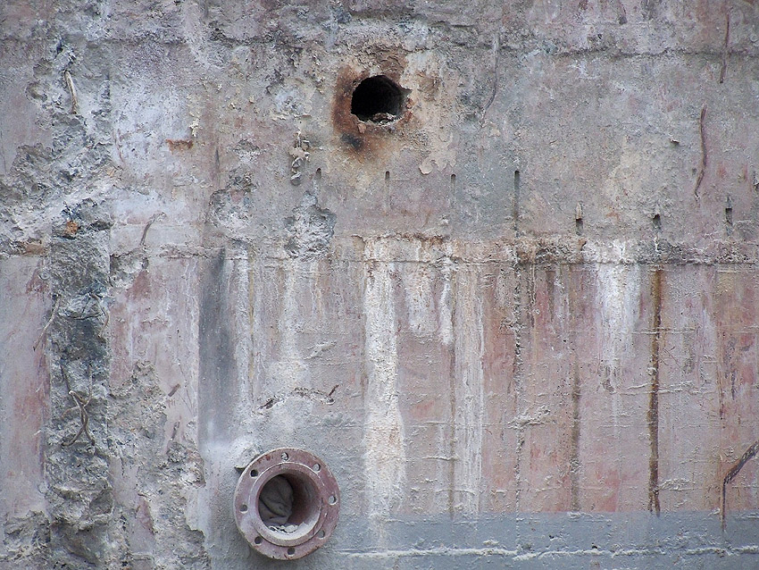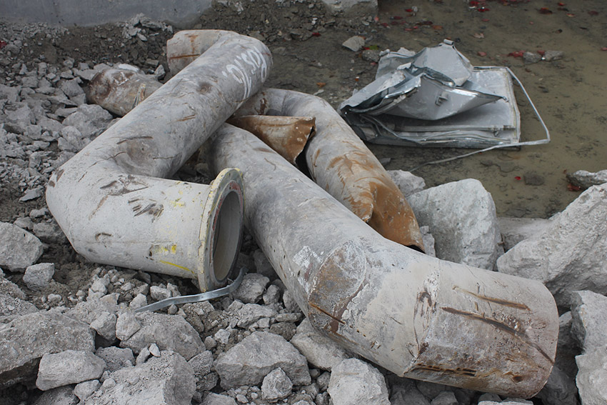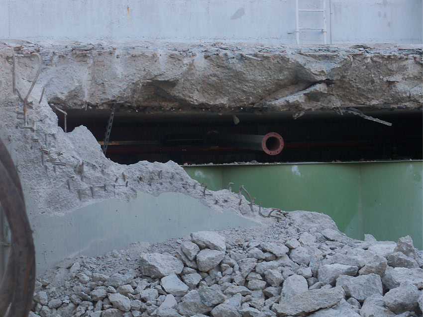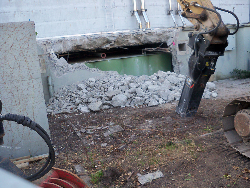 Hier im Hintergrund an der Hauptbunkerkörperwand letzte Reste der ehemaligen Ziegelrot-Tarnbemalung der Wände, geschützt lange Zeit vor der Witterung durch den nachkriegszeitigen Anbau (Zivilschutzbindung). Der Beginn vom Ursprungsanbau befand sich genau rechts an der Baggerschaufel.