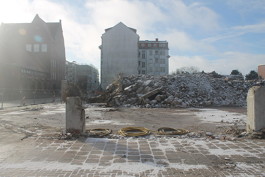 Der Trümmerschutt wurde großteilig entfernt. Die restlichen Außenwandreste des ehemaligen Vorbaubereiches Mitte / Süd wurden fast vollständig abgetragen. Wir berichten weiter.
