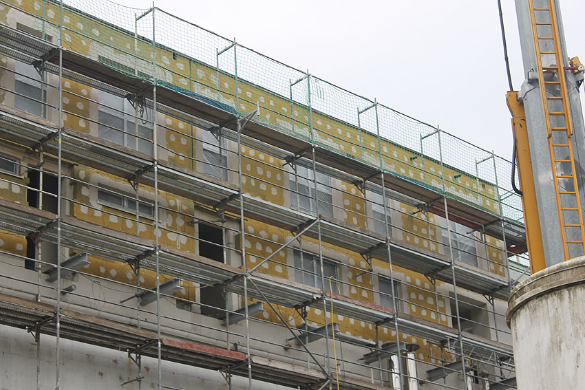 Das letzte Baugerüst an der Virchowstraße wurde von der Bunkerwand entfernt. So präsentiert sich das überbaute Weltkriegsrelikt nun dem Betrachter: