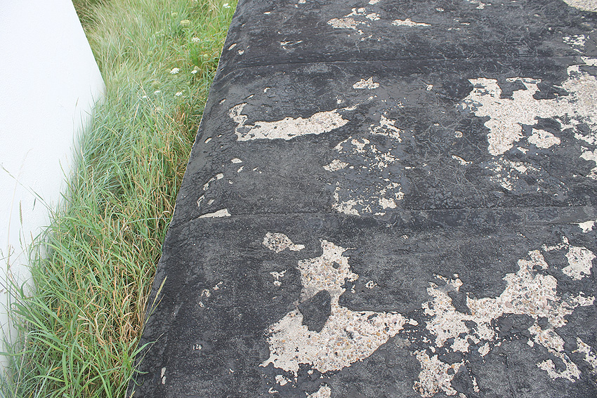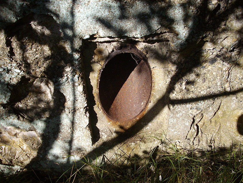 Hier zu sehen wäre dann derjenige Bereich mit typischer runder MG-Schützen-Öffnung in der Decke. Aus der Luft sind hier äußerlich scheinbar Ecken in der Schalungsform zu sehen, welche oft bei Tobrukständen ausgeführt worden sind.