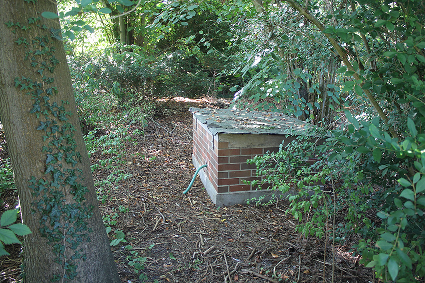Bei diesem Objekt im Dorfkern an der Zedeliusstraße handelt es sich um das rückwärtige Teilstück eines Ein-Röhren-Deckungsgrabens. Zu sehen ist hier der Notausstiegsturm. Das Innere dürfte heute als Wasserzisterne dienen. Rechts daneben am nahen Wohnhaus ist zudem ein Hügel zu erkennen, wie auch direkt hinter dem Objekt. Hier wird die Röhre verlaufen, eventuell sogar mit L-Knick? Der Eingang wird sich demnach entweder direkt an der Robbenstraße östlich der Zedeliusstraße befunden haben oder ebenfalls an der Zedeliusstraße weiter südlich. Diesen Eingang haben wir bisher noch nicht entdecken können. Eventuell ist er zugeschüttet.