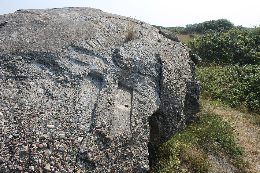 Überall Betontrümmer gesprengter Bunker und Batterien: