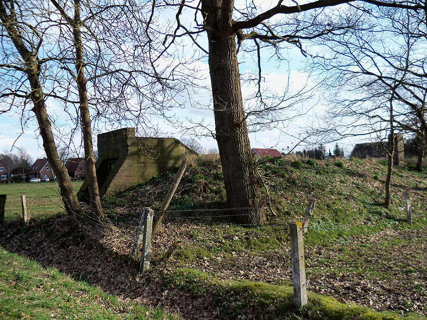 Die Gestaltung der Gesamtanlage weist starke Ähnlichkeiten zum ehemaligen Deckungsgraben Lohne in Jever auf und einem weiteren Deckunsgraben mit unbekanntem Standort in Siebetshaus / Moorwarfen. Der Eingangsschutzbau ist identisch. Auch die Vermauerung des Einganges ist sehr ähnlich wie beim Deckungsgraben Lohne in Jever ausgeführt worden.
