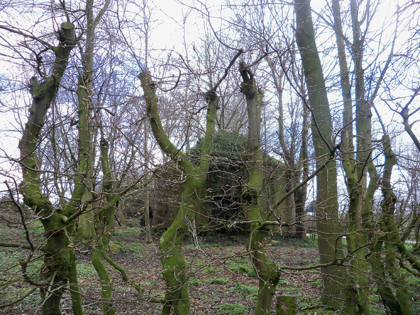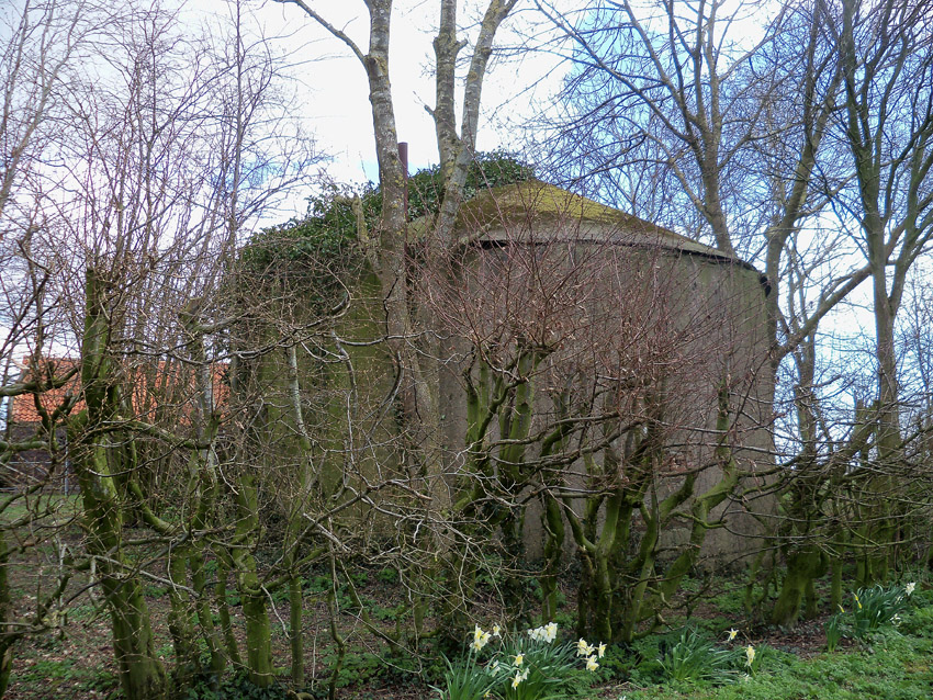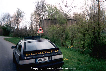Hier zu sehen der geöffnete Notausstieg. Aufgrund der Demilitarisierung nach dem Krieg wurde der Notausstiegsbetonblock oder die dortige Stahlklappe beseitigt. Der Haupteingang befindet sich genau gegenüber. Eine Ähnlichkeit zur Wilhelmshavener Rundturmserie ist durchaus vorhanden. Aber auch die vier nahe Cäciliengroden befindlichen Rundbunker (Lager Neudeich) haben auffällige Ähnlichkeit.