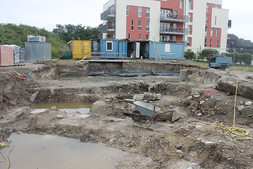 Die Betonstrukturen im Baustellenbereich sind größtenteils beseitigt worden. Weitere Strukturen als die ersichtlichen sind nicht mehr ans Tageslicht getreten. Nun erfolgt die Tiefgründung des Neubaues.