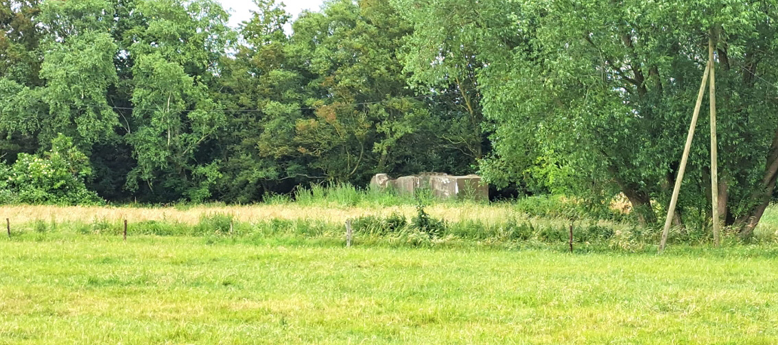 Mindestens zwei betonierte Geschützbettungen für 8,8 cm Flak (Nord / Süd) im (wohl) gesprengten Zustand sind noch vorhanden, hier zu sehen die südliche Bettung.