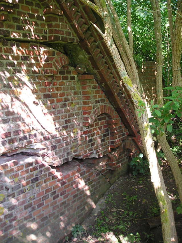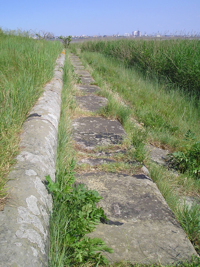 Folgende Bilder: Das ersichtliche Betonfundament und das Gebäude links im Hintergrund, gelegen direkt hinter dem Deich nahe der Zuwegung zu Langlütjen I, sind Relikte aus dem WK 2. Hier befanden sich Unterkünfte für die Mannschaften von Langlütjen I. Auf dem Ring-Betonfundament stand eine Wehrmachtsbaracke.