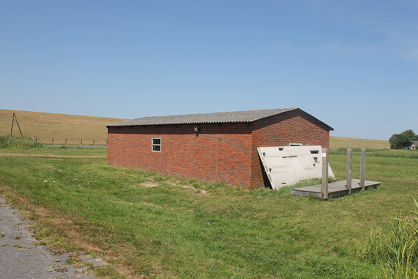Oben: Rechts Süd-Teilbereich des ehemaligen Wirtschaftsgebäudes / inzwischen saniert und renoviert / das Restaurant auf dem Deich im Bereich Peters-Denkmal hat keinen historischen Zusammenhang mit der Flakstellung bzw. mit dem anliegenden Untergruppenkommando Ost.